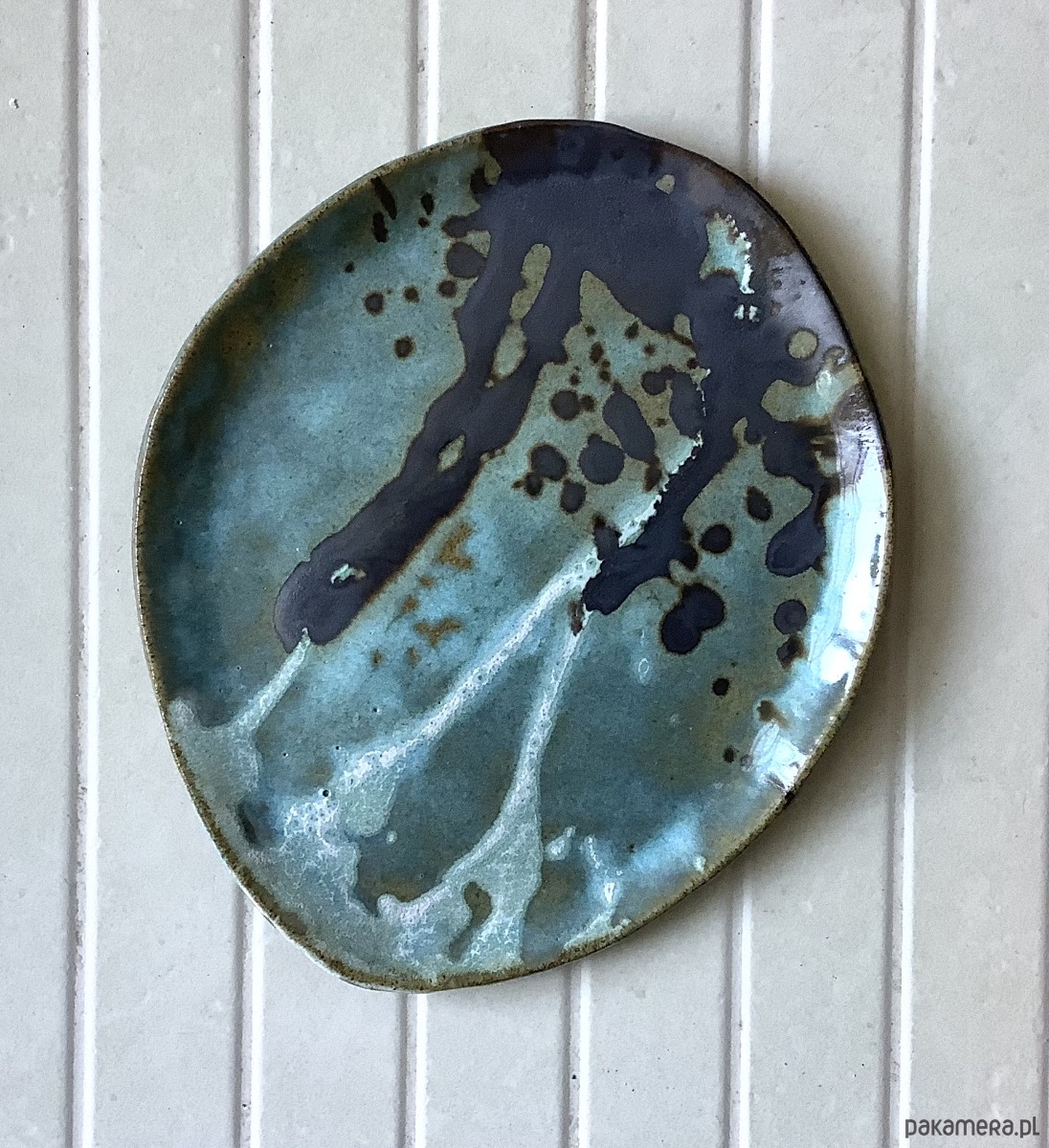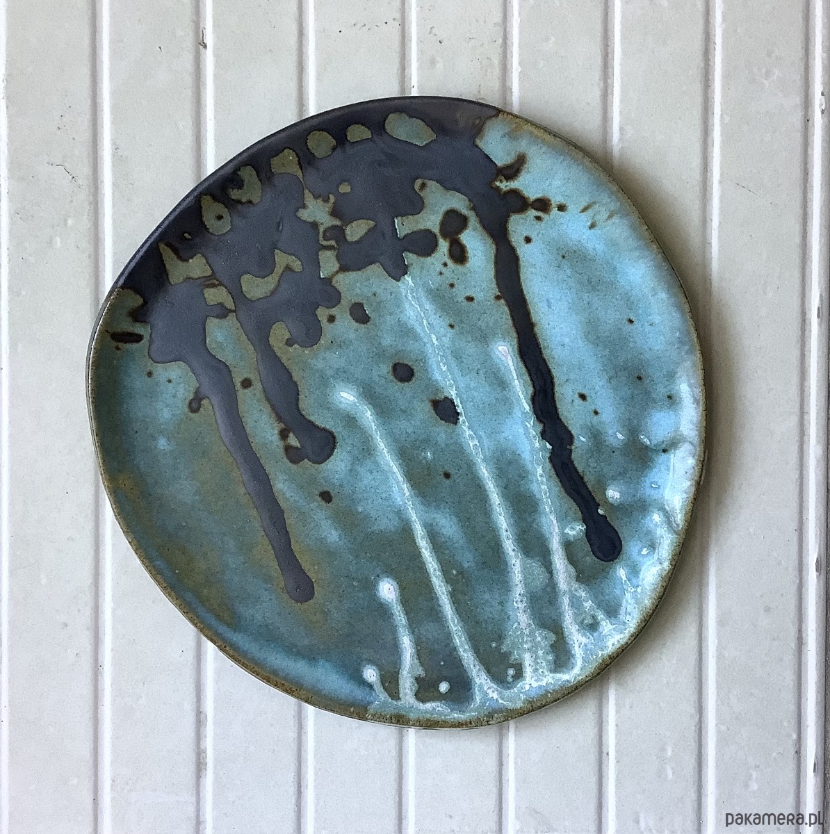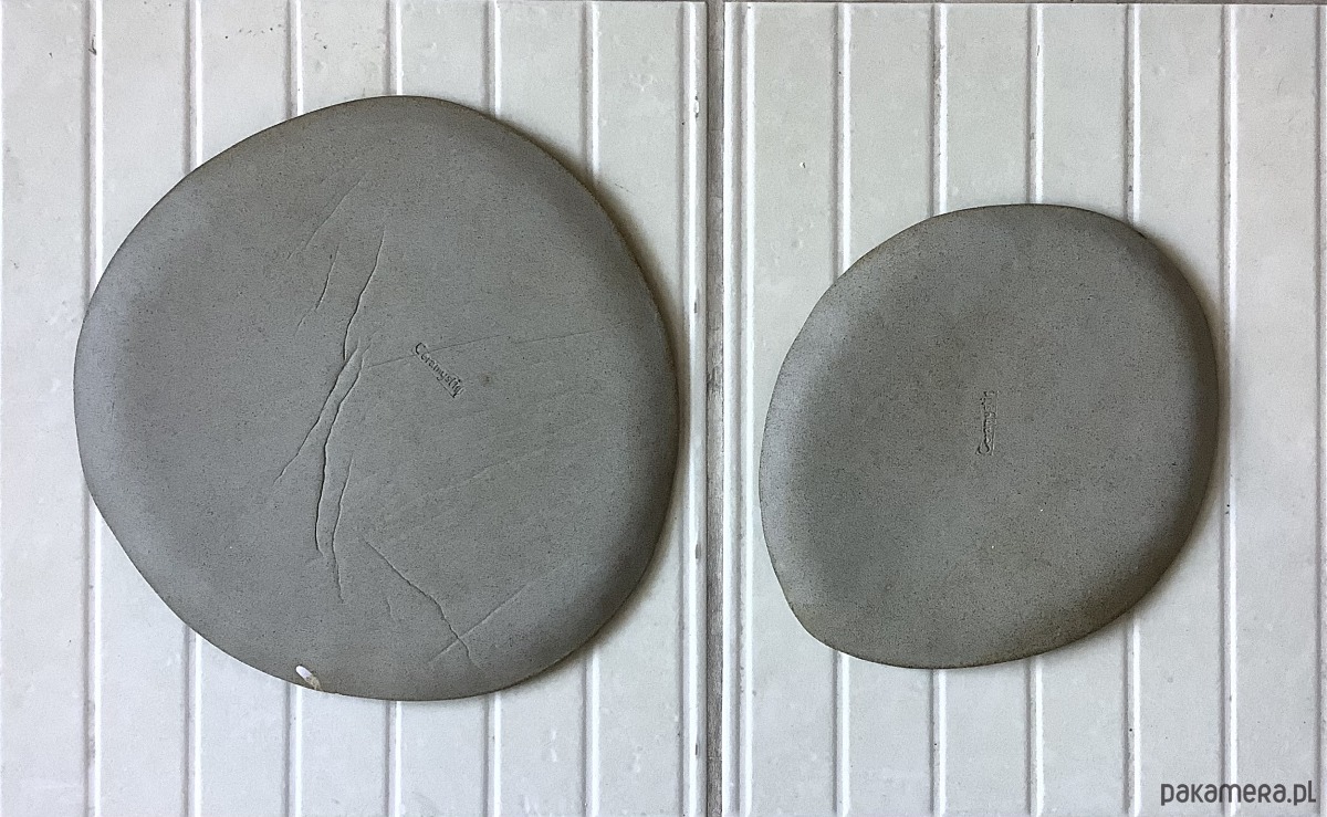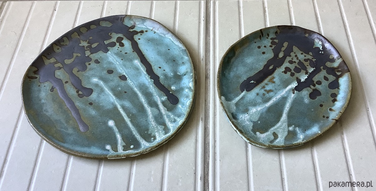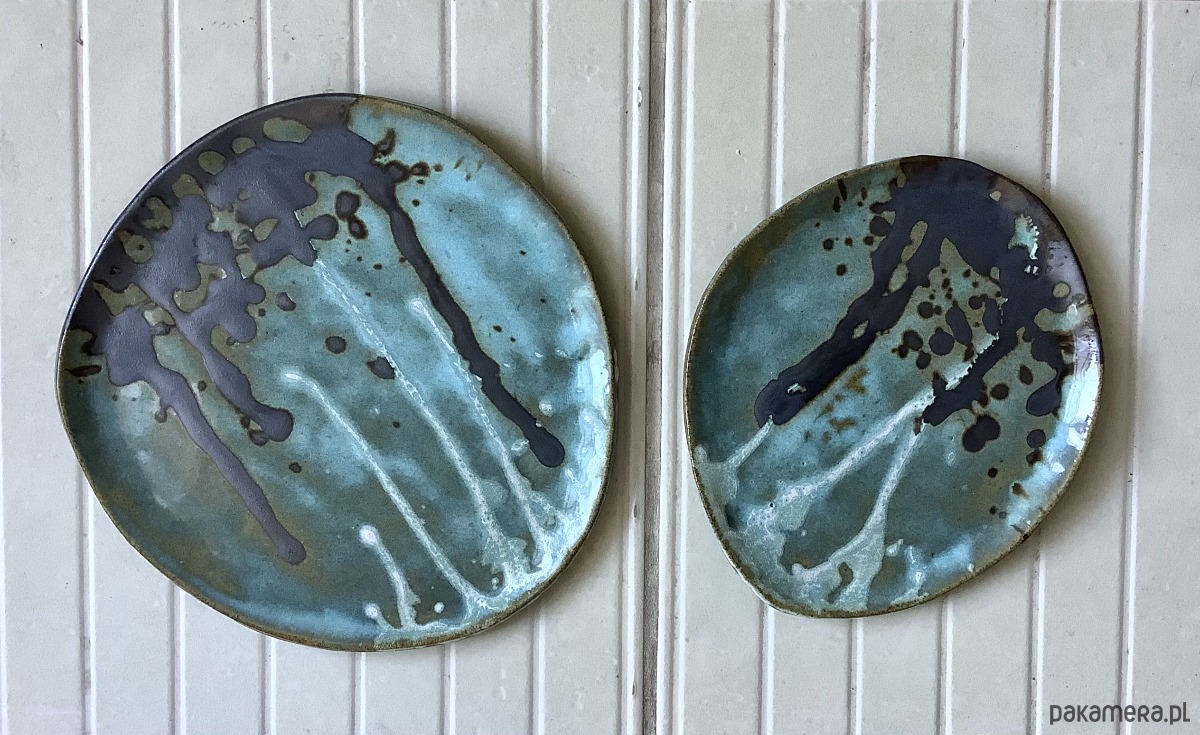 Zapraszam do kupna talerzy ręcznie robionych z szarej gliny. Każdy wyjątkowy i jedyny w swoim rodzaju, chociaż szkliwione tym samym szkliwem - satynowym turkusowym, zaś zdobienia w kolorze czarnym i białym. Komplet składa się z 2 talerzy: dużego i mniejszego. Wymiar dużego talerza: 24 x 23,5 cm, mniejszego: 18 x 20,5 cm.