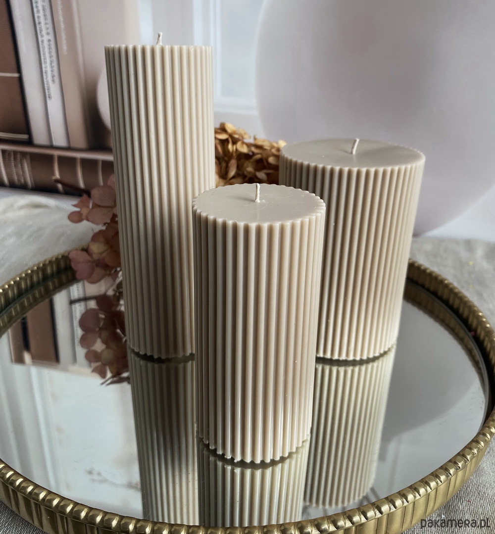Wprowadź do swojego wnętrza ciepły, elegancki klimat dzięki luksusowemu zestawowi ręcznie wykonanych świec w odcieniu beżu.