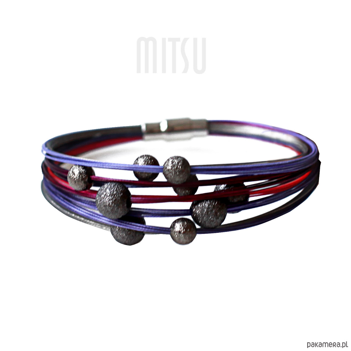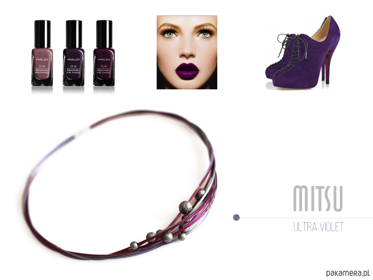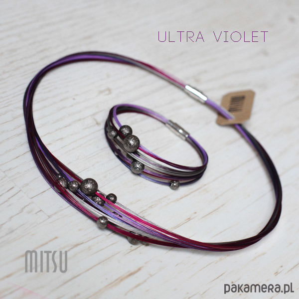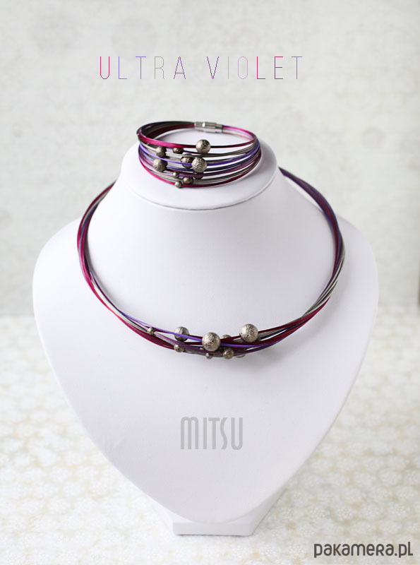Śliwkowy komplet, wykonany ze stalowych linek pokrytych nylonem w kilku odcieniach fioletu oraz metalowych teksturowanych kul.