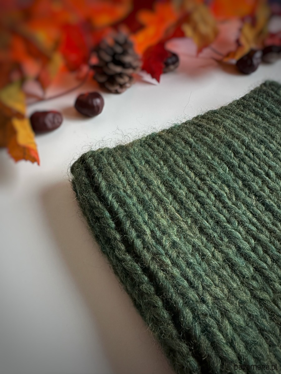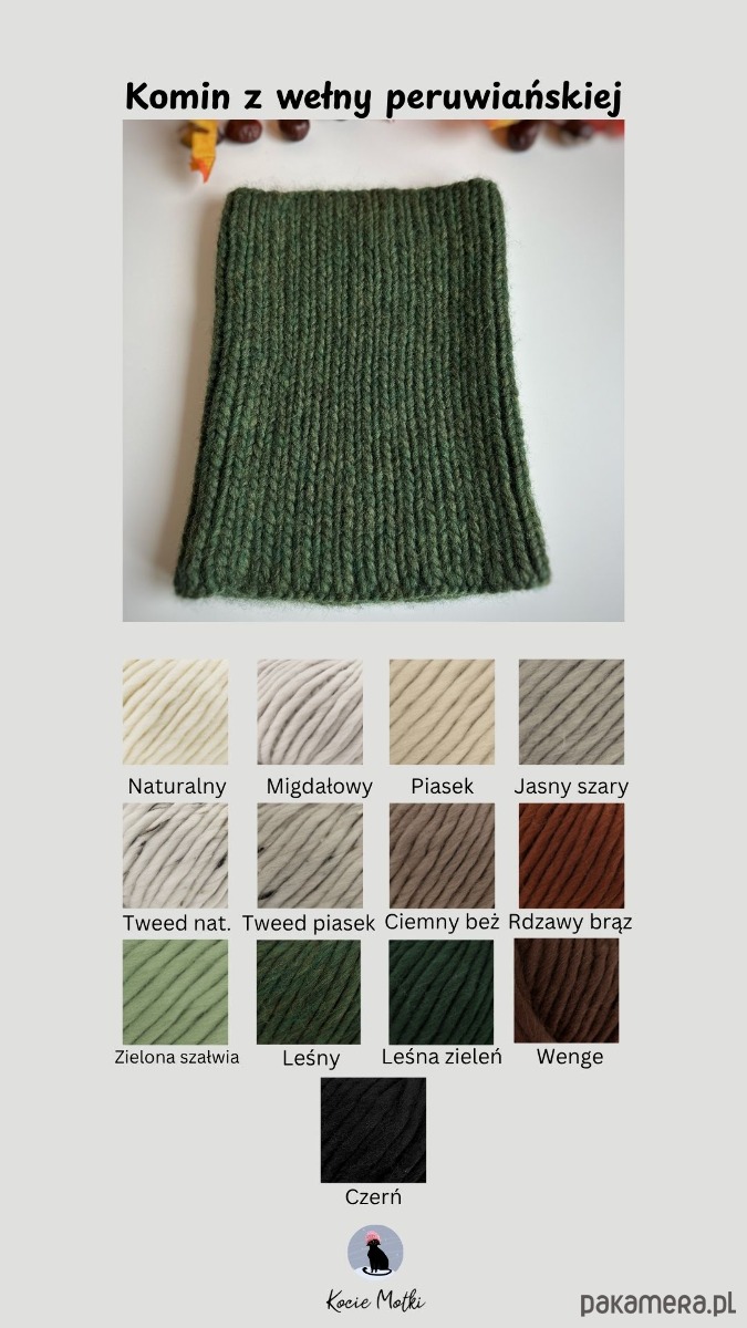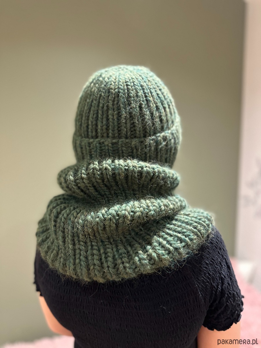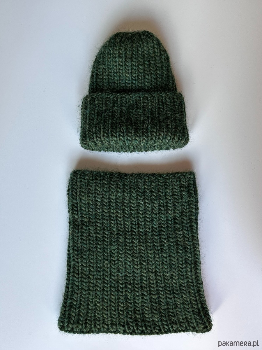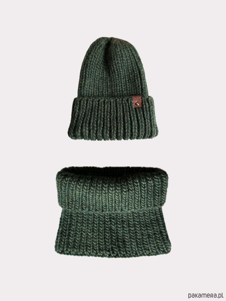 Ręcznie robiony wełniany komplet wykonany z grubej, miękkiej i w 100% naturalnej wełny peruwiańskiej, składający się z czapki i komina.