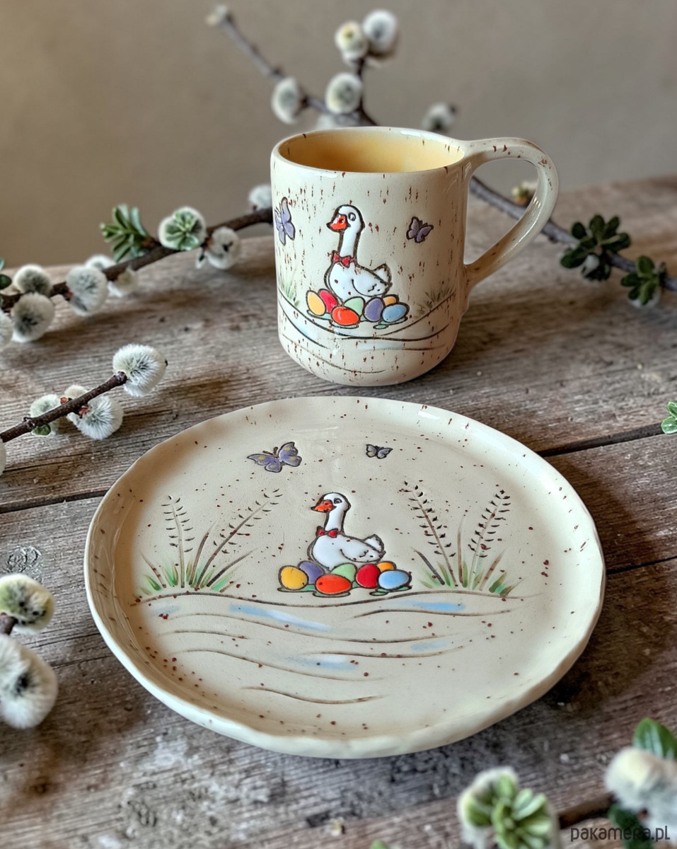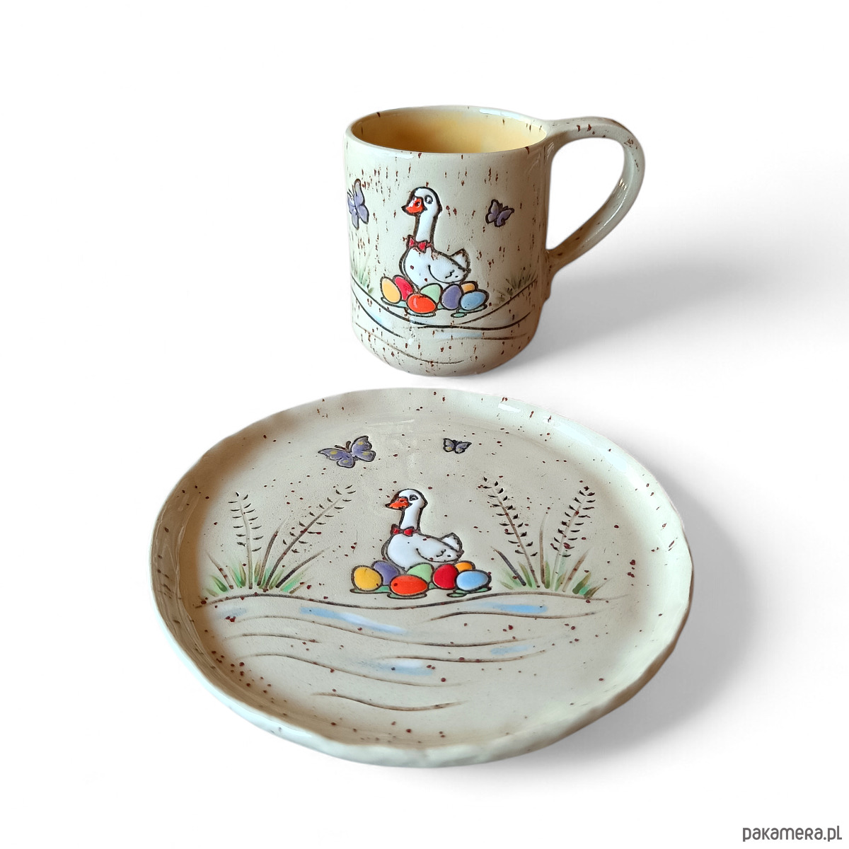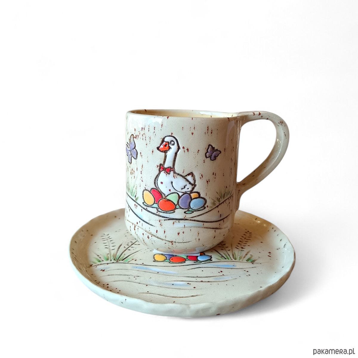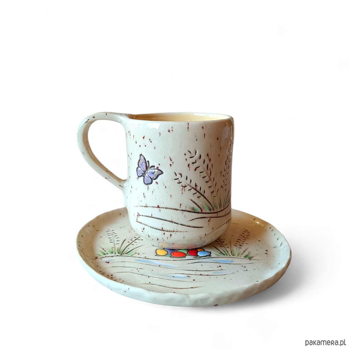 Komplet ceramiczny składający się z kubka i talerzyka.