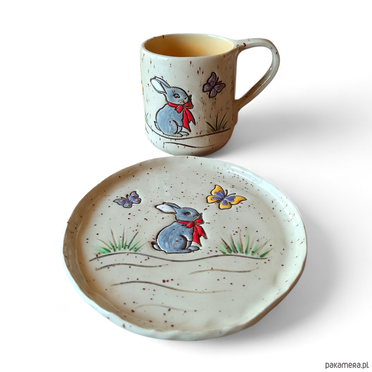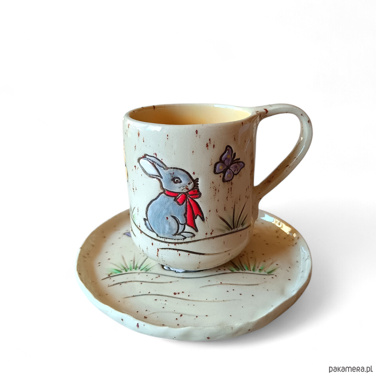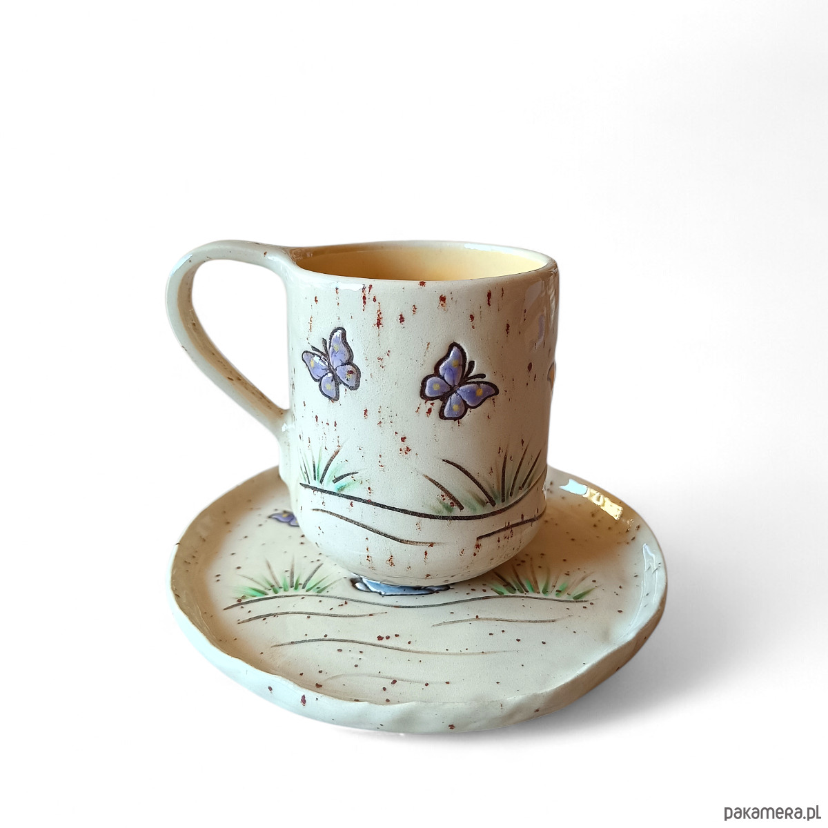 Komplet ceramiczny składający się z kubka i talerzyka.