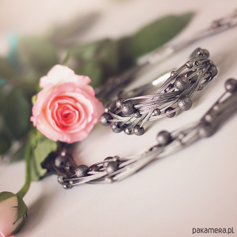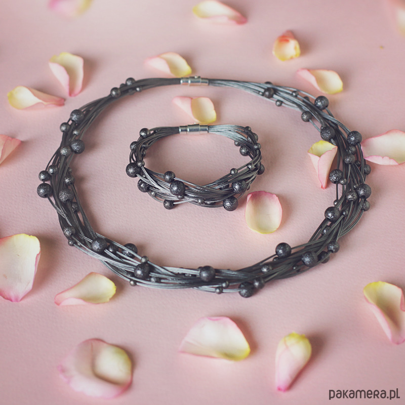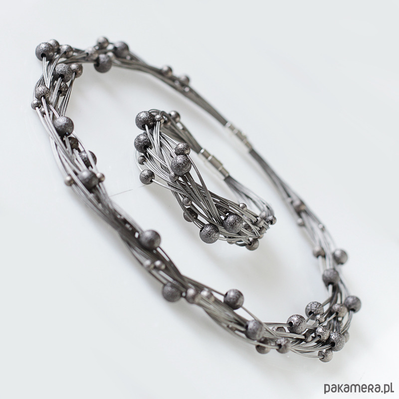 Komplet wykonany jest z linki jubilerskiej oraz metalowych teksturowanych kul.