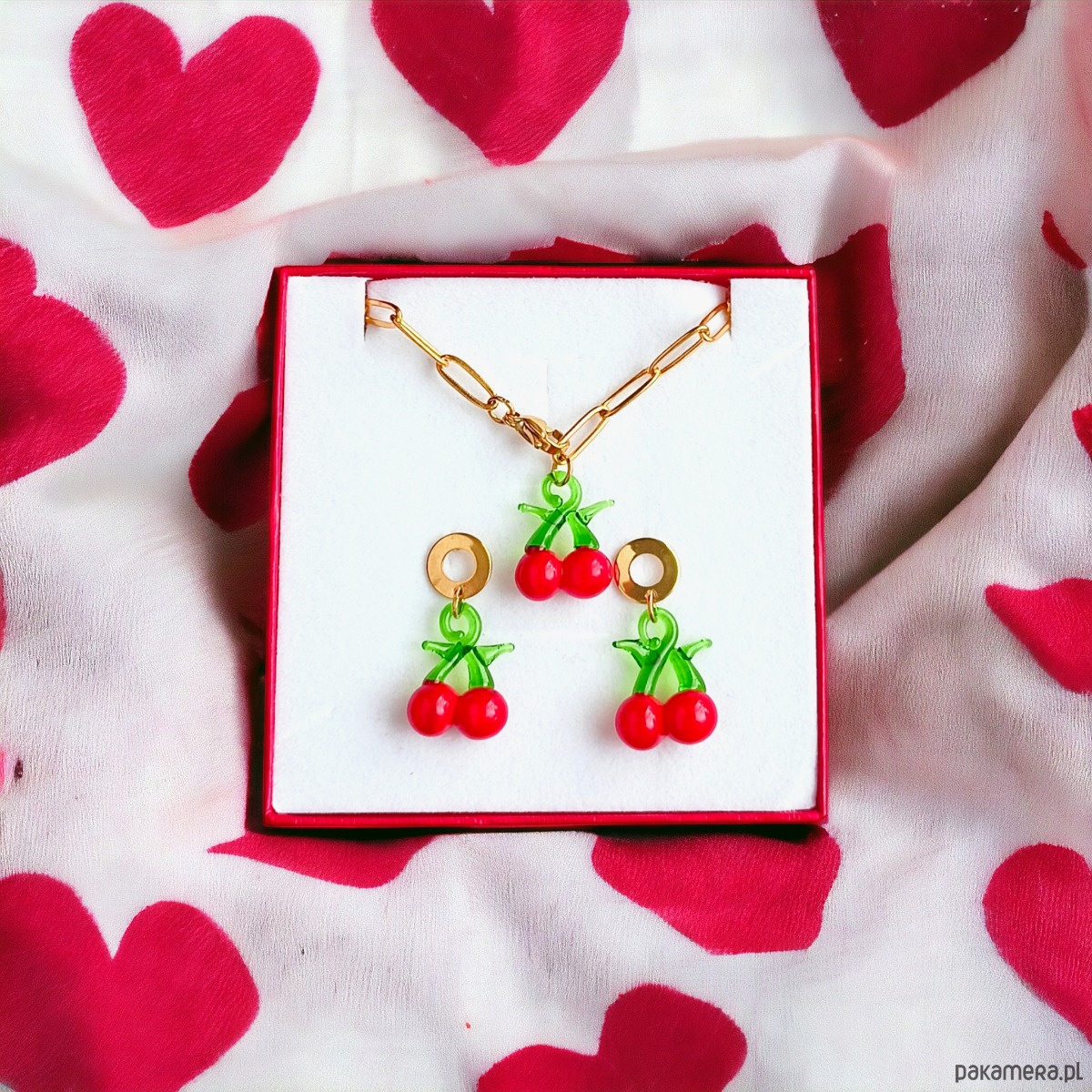 KOMPLET : wisienki : naszyjnik długość regulowana, kolczyki