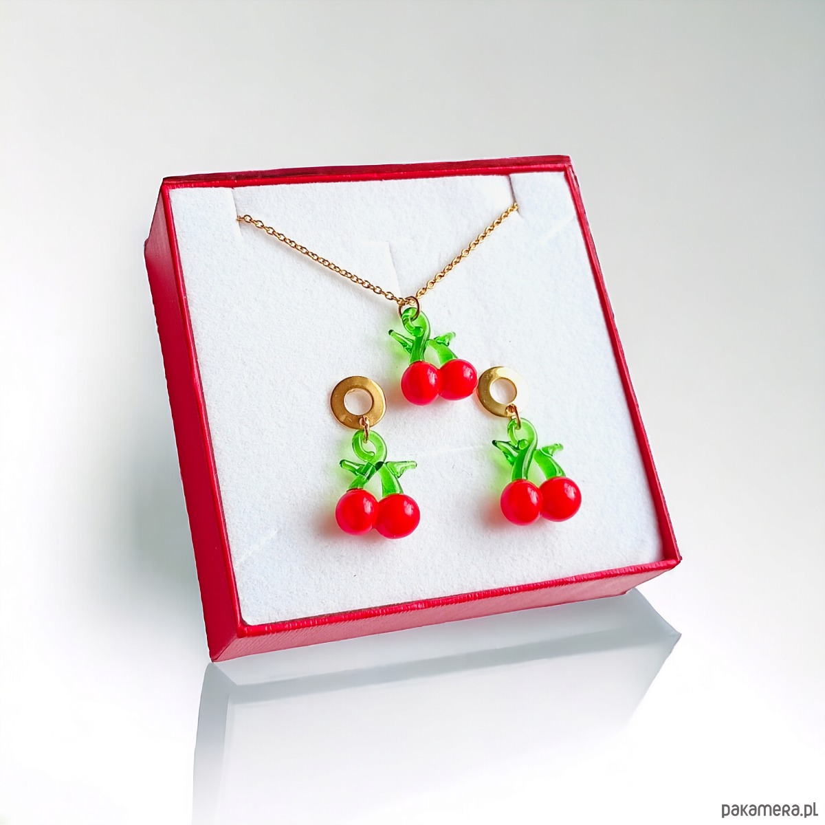 KOMPLET : wisienki : naszyjnik klasyczny łańcuszek, kolczyki