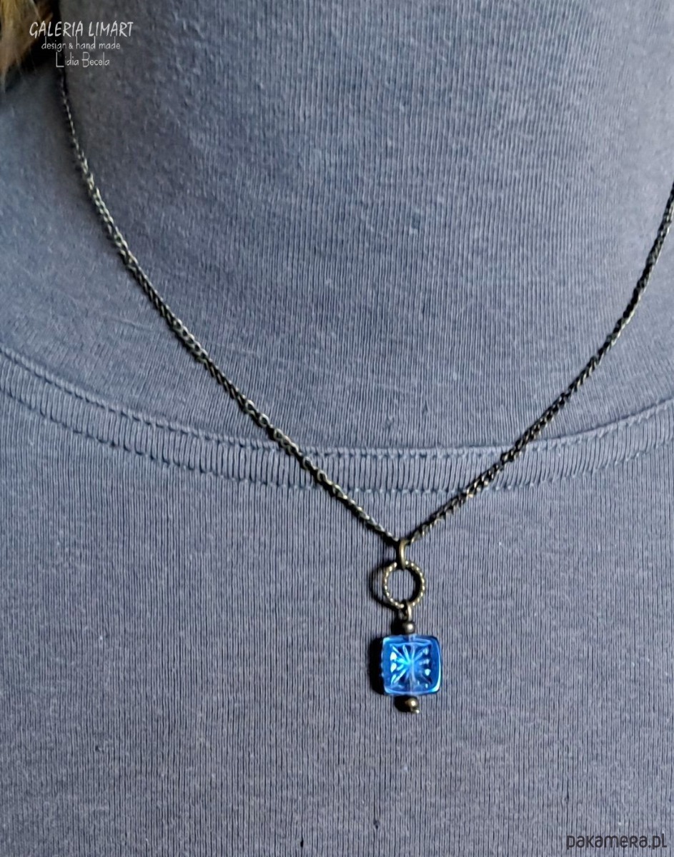 Klasyczny miły dla oka komplet - wisiorek i kolczyki z błękitnego czeskiego szkła. Długość łańcuszka ok 42 cm, kolczyki ok 4 cm.