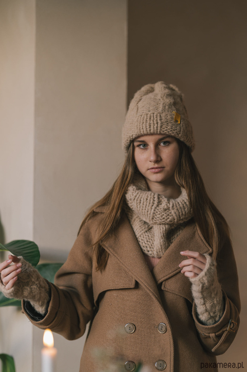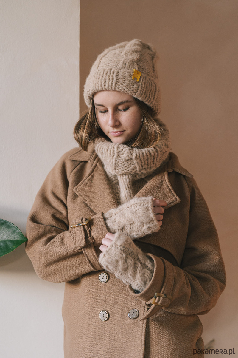 Komplet z alpaki wełniana czapka, komin i mitenki z warkoczami LULLABY