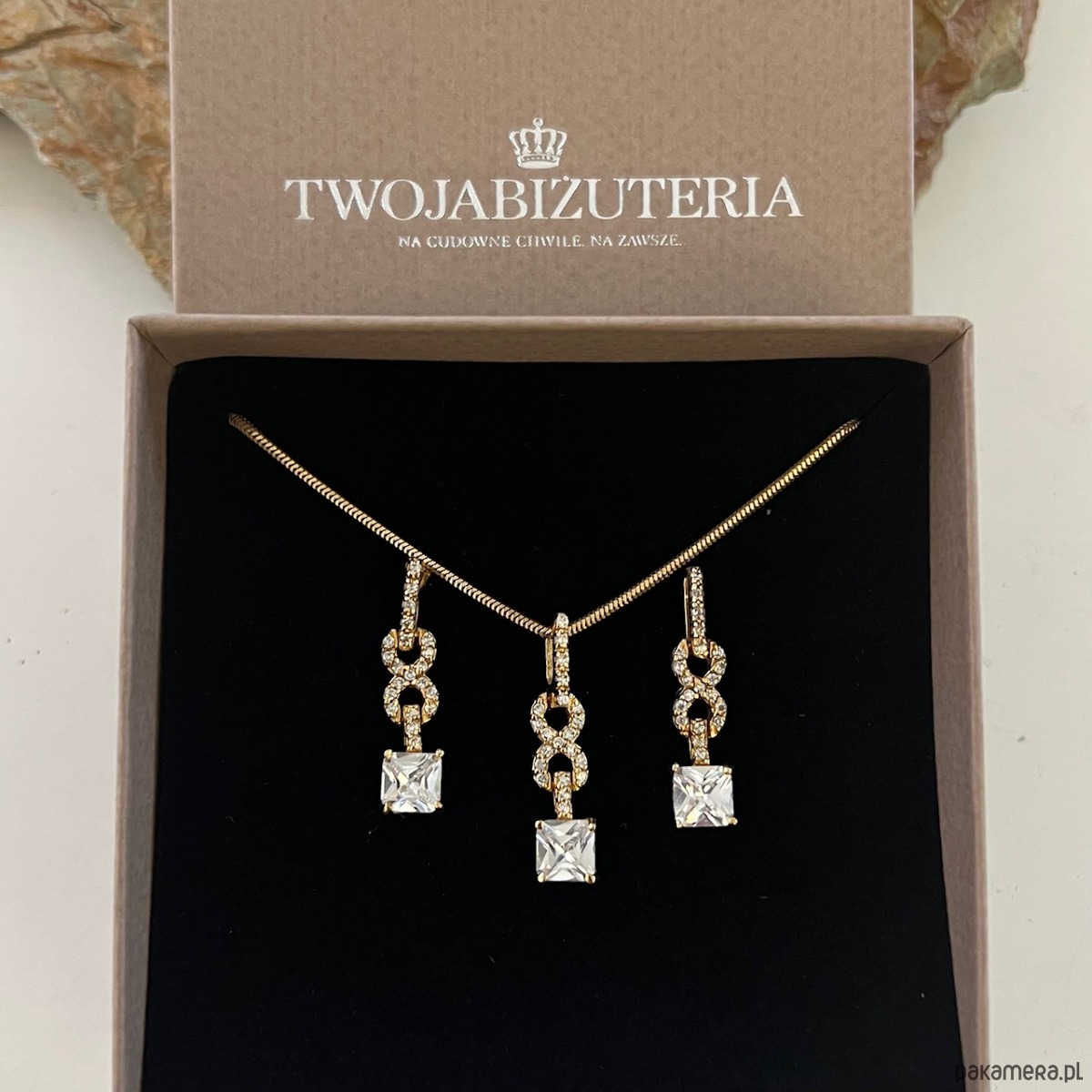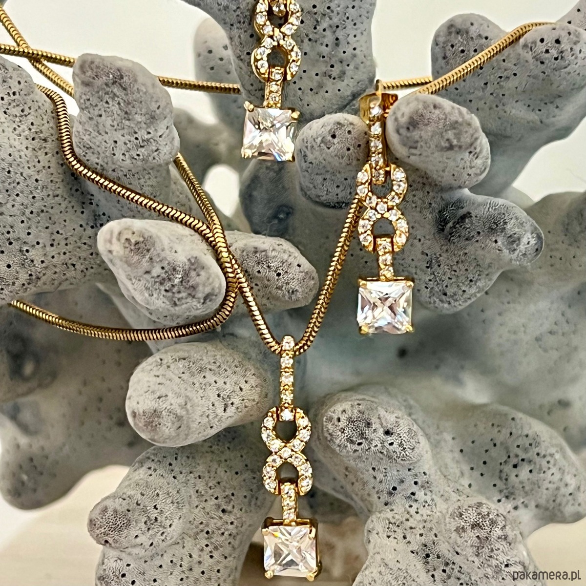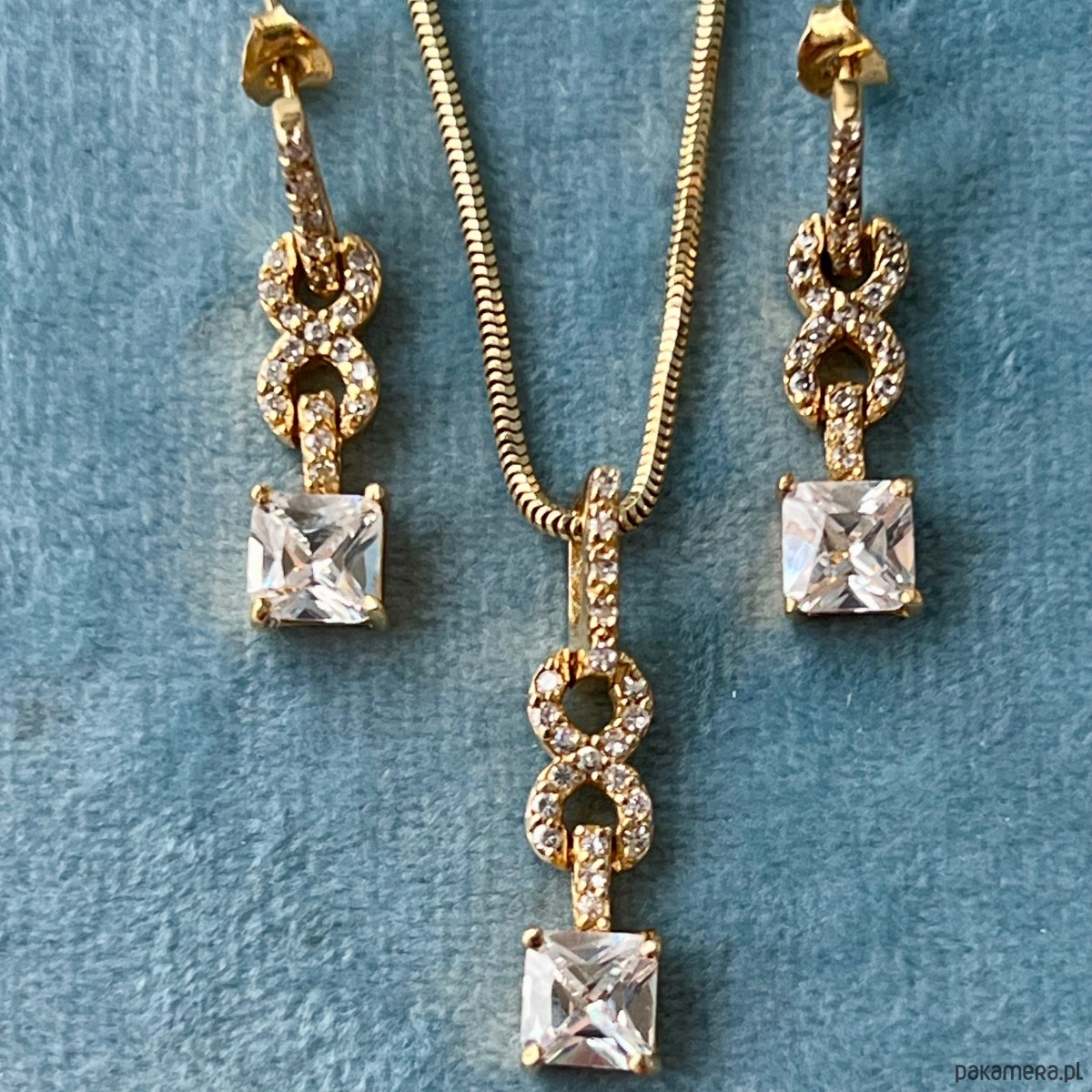 Komplet – znak nieskończoności z cyrkoniami. Naszyjnik i kolczyki wiszące – srebro pr. 925 pozłacane