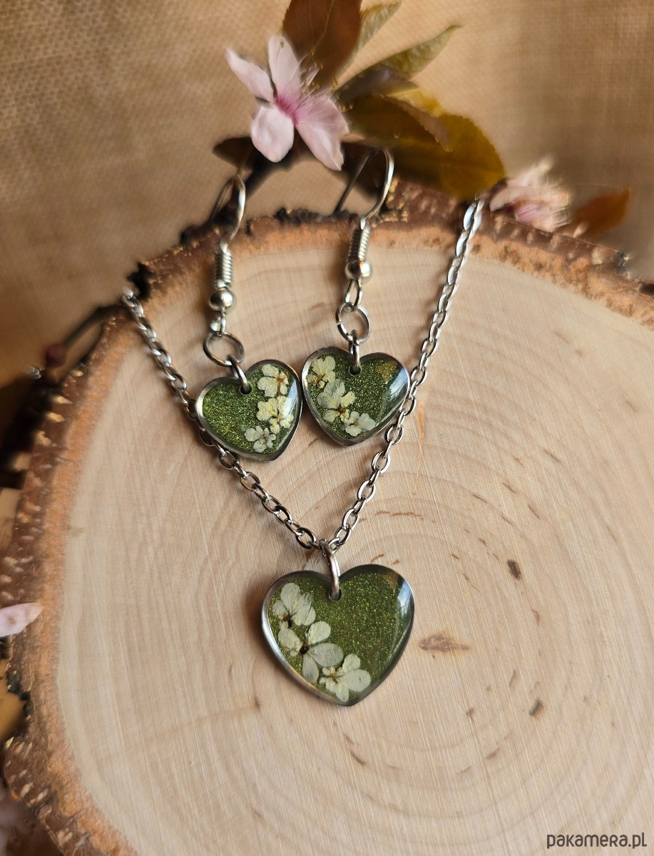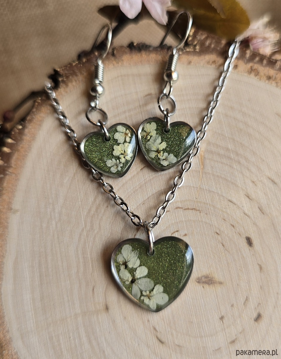 Oferuję Państwu unikalną biżuterię. Komplet jest wykonany z suszonych kwiatów i żywicy epoksydowej. Biżuteria jest wspaniałym i oryginalnym prezentem na lata.