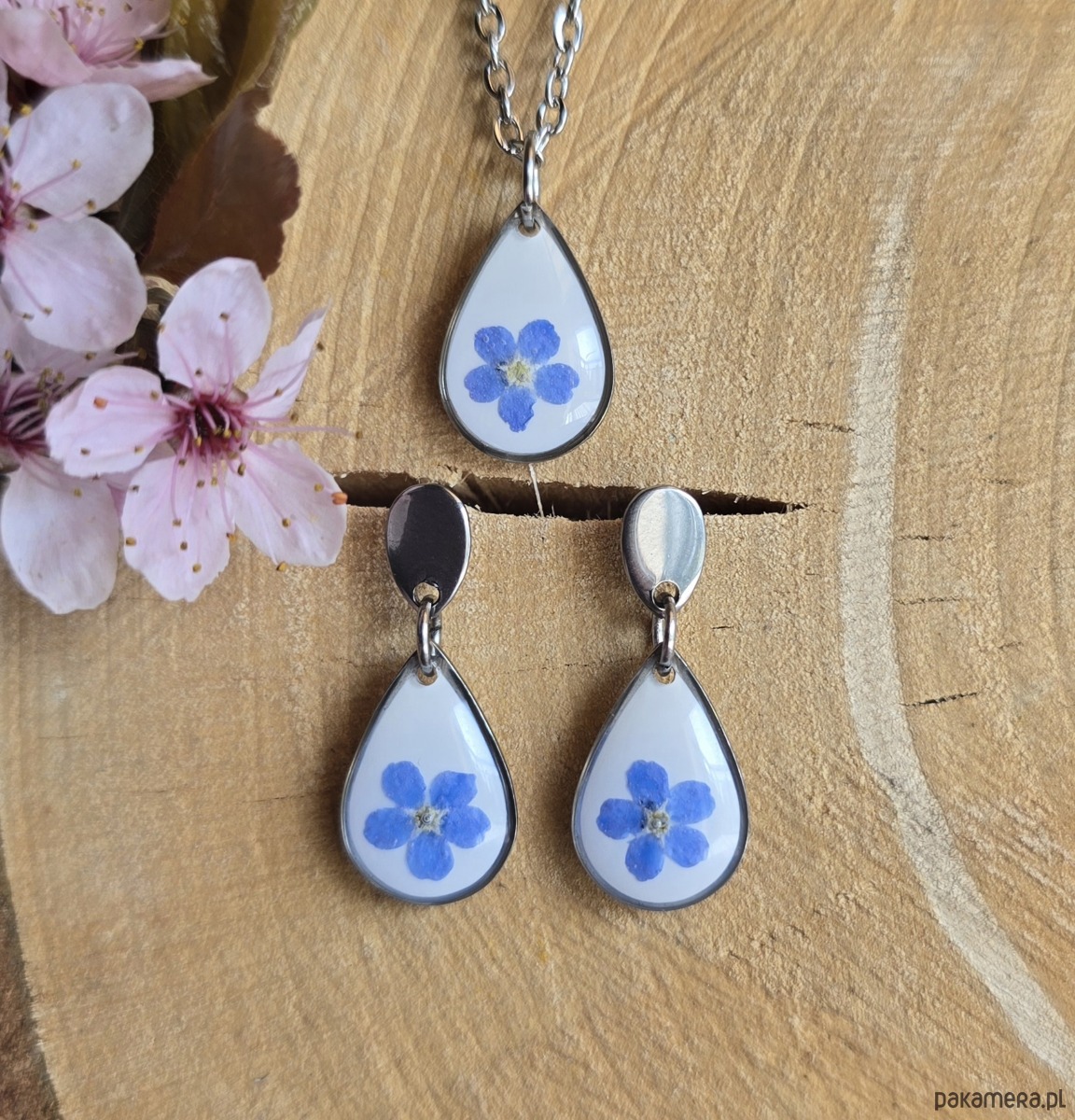 Komplet zawieszka i kolczyki srebrne z kwiatami łezki niezapominajki