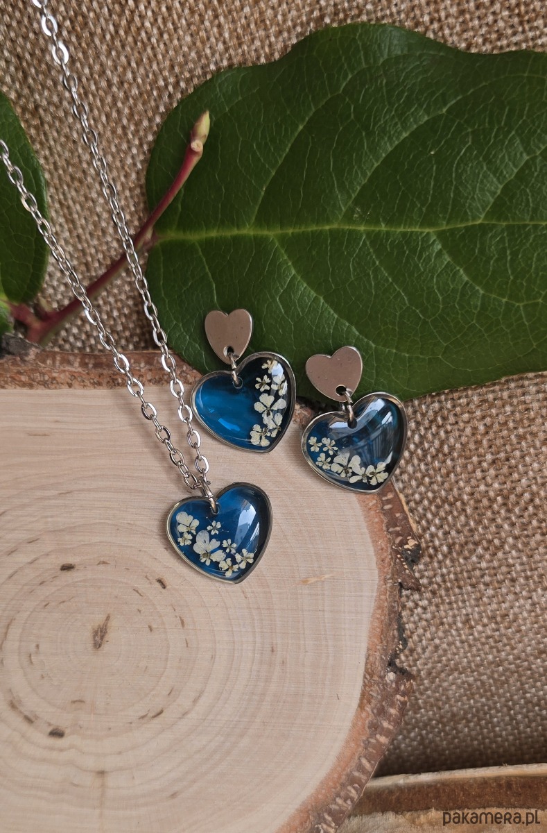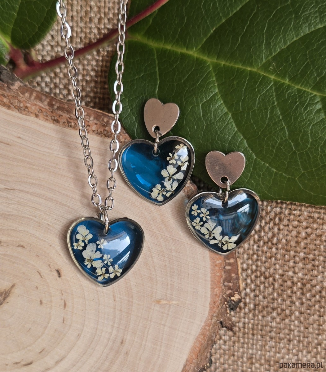 Oferuję Państwu unikalną biżuterię. Komplet jest wykonany z suszonych kwiatów i żywicy epoksydowej. Biżuteria jest wspaniałym i oryginalnym prezentem na lata.