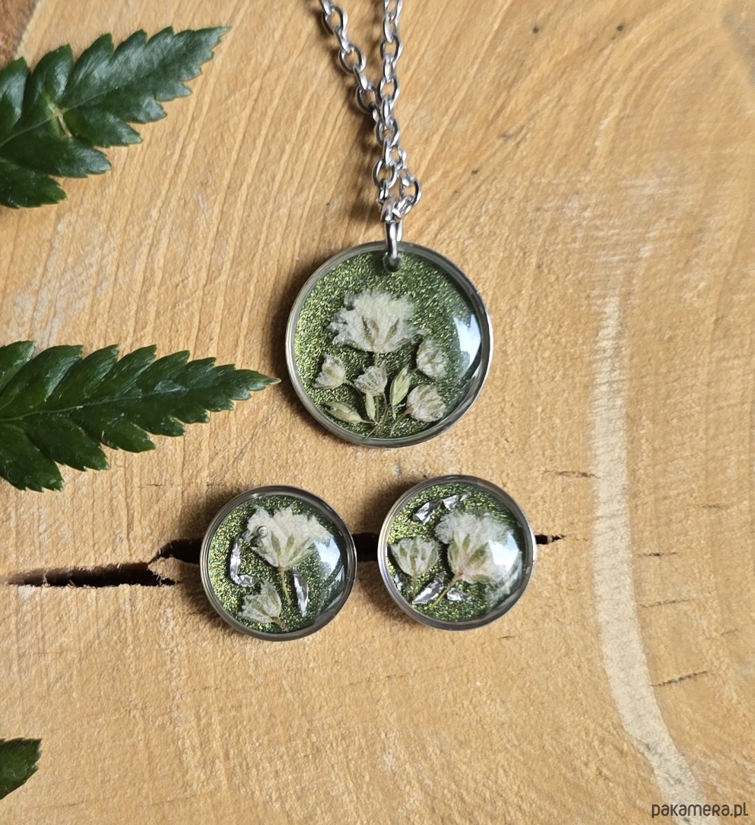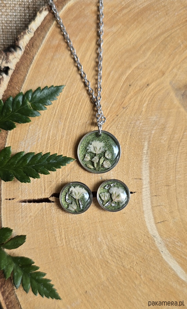 Oferuję Państwu unikalną biżuterię. Komplet jest wykonany z suszonych kwiatów i żywicy epoksydowej. Biżuteria jest wspaniałym i oryginalnym prezentem na lata.