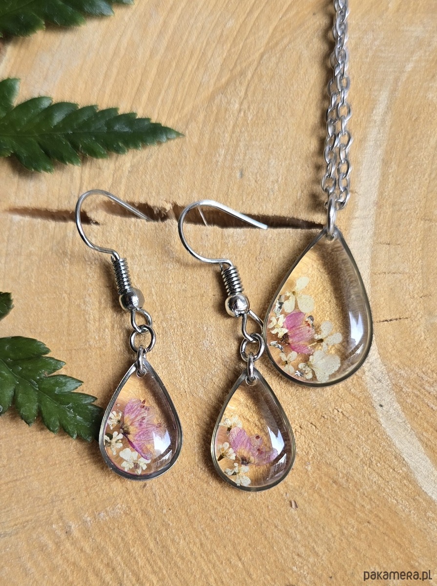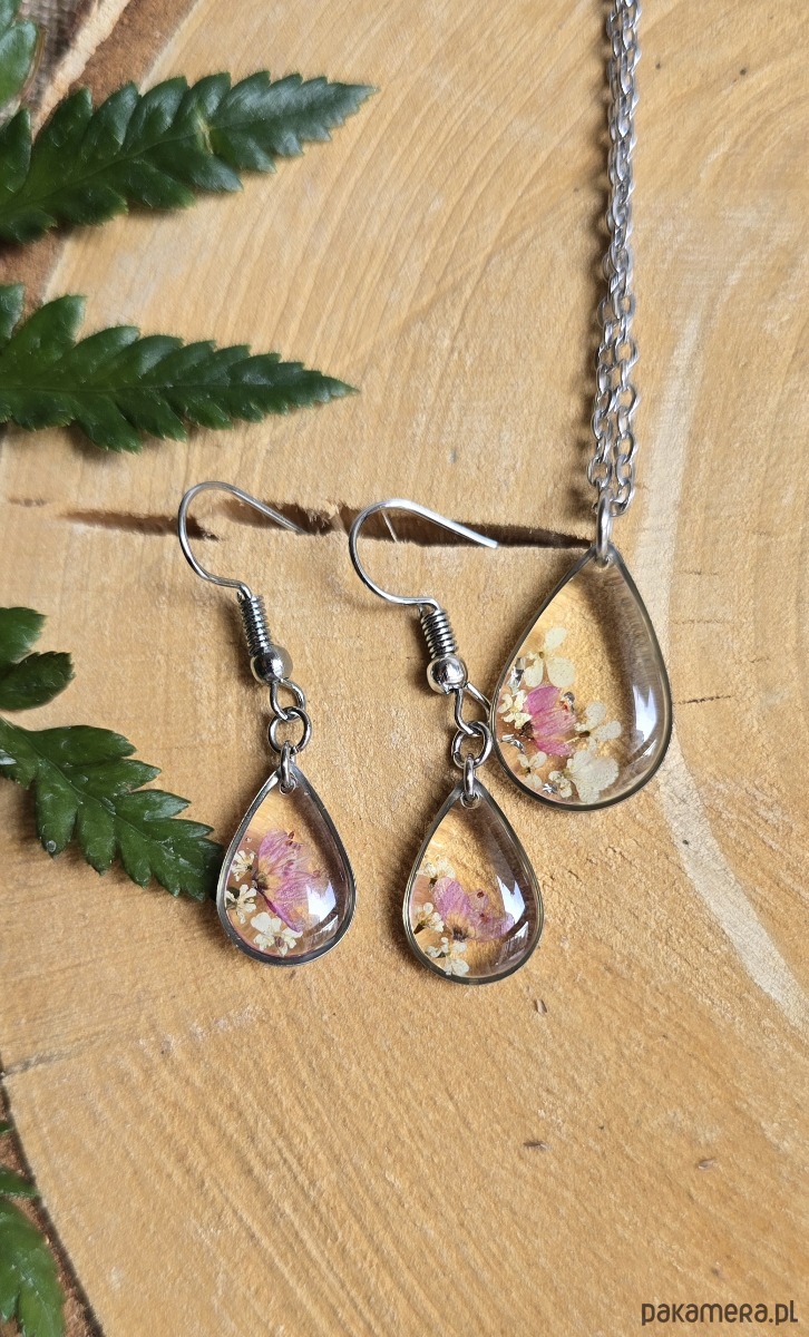 Oferuję Państwu unikalną biżuterię. Komplet jest wykonany z suszonych kwiatów i żywicy epoksydowej. Biżuteria jest wspaniałym i oryginalnym prezentem na lata.