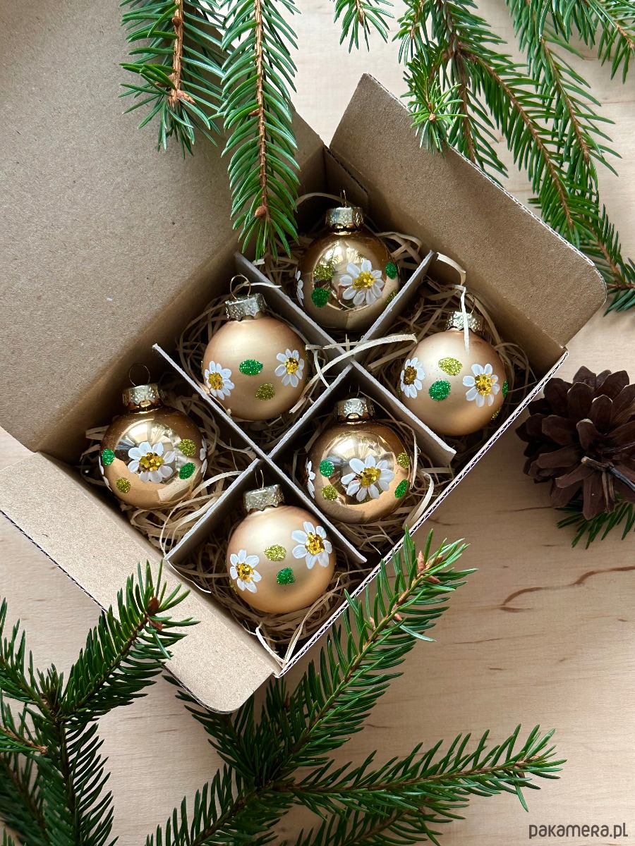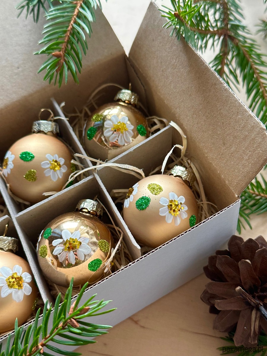 Komplet 6szt ręcznie malowanych złotych bombeczek ze szkła.