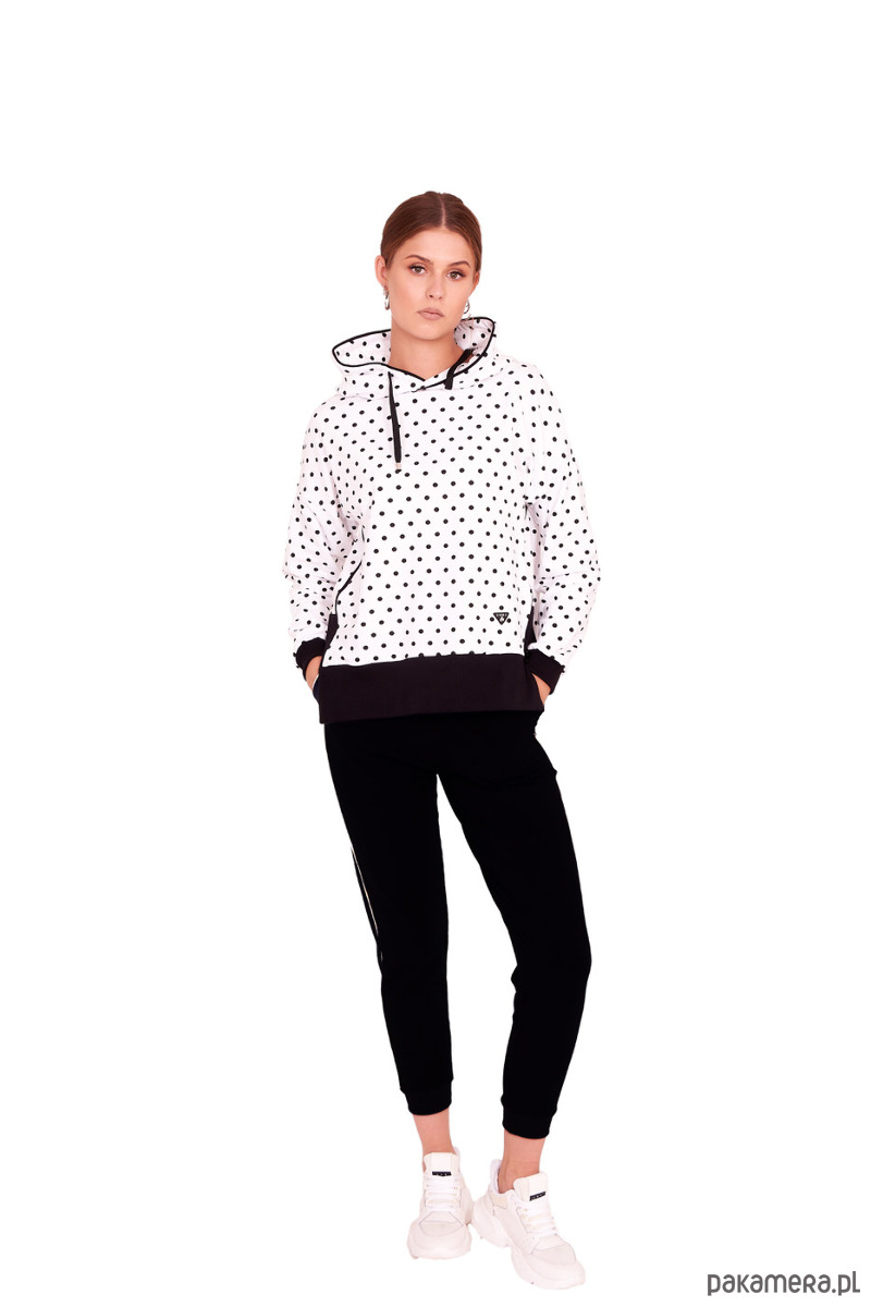 Wygodna bluza z mięciutkiej dzianiny, o ciekawym kroju . Ciekawą formą są wstawki w kolorze ecri,sznurki oraz końcówki metalowe grawerowany z naszym logiem 3 FOR U. Szerokie ściągacze z przodu i z tyłu ,ale jak się przyjrzycie z boku również są ciekawe cięcia i wstawki.