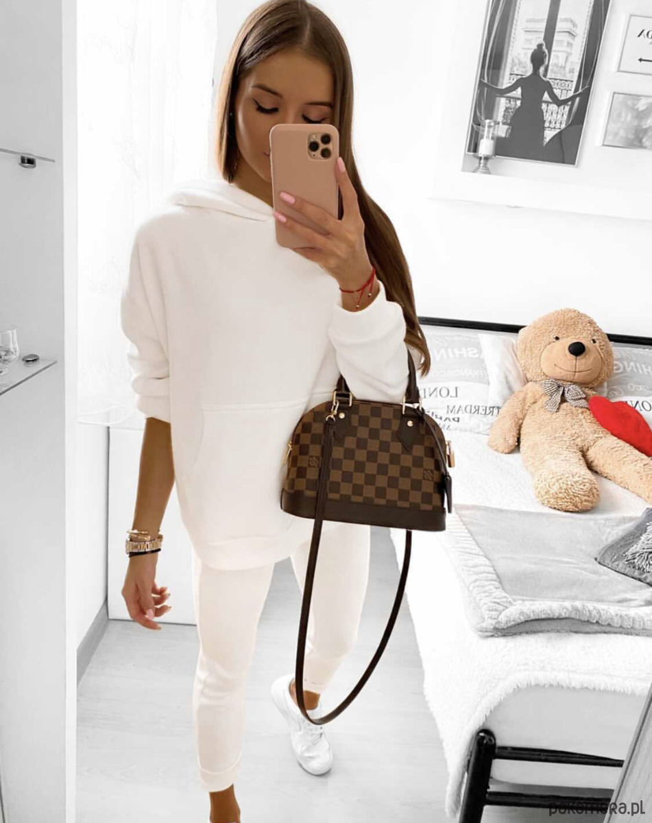 Dres z wysokiej jakości dzianiny sweterkowej składający się z bluzy typu "kangurka'' i spodni z gumą w pasie i ściągaczami na dole. Komplet dostępny w rozmiarze S M L. Idealna stylizacja na co dzień !