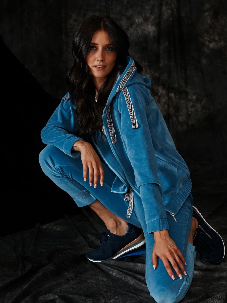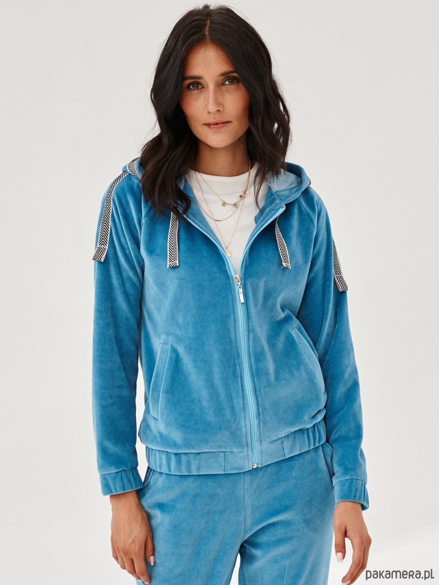 Bluza AMIKA uszyta z miękkiej dzianiny. Dzianina to połączenie bawełny z elastanem, która posiada certyfikat EOKO-TEX. Bluza jest zapinana na zamek. Dół bluzy oraz rękawy ujęte w gumę. Na przodzie kieszenie. Kaptur oraz rękawy ozdobione taśmą. Taśma ze sportowymi akcentami, tkana w jodełkę.