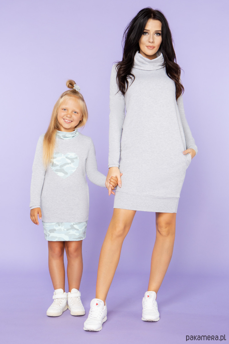 Urokliwa sukienka z dzianiny dresowej z półgolfem i kieszeniami. Wersja dla dziewczynki z ciekawymi dodatkami do wyboru. Rękaw długi.