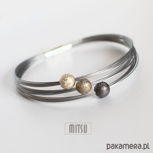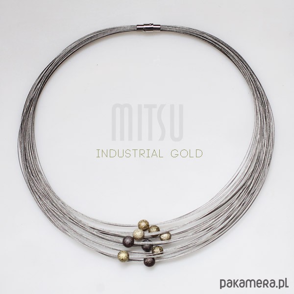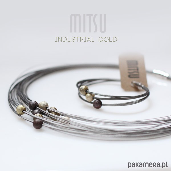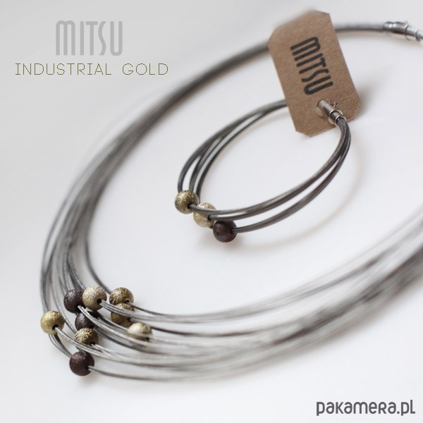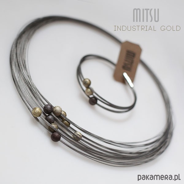 Komplet złożony z naszyjnika i bransolety typu slim. Nowoczesny industrialny charakter, w lekko złotej tonacji. Wykonany na bazie stalowych linek krytych nylonem oraz teksturowanych kul. Zapięcia magnetyczne. Całość podróżuje ładnie zapakowana. Polecam :)