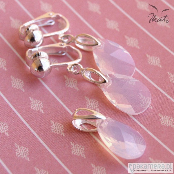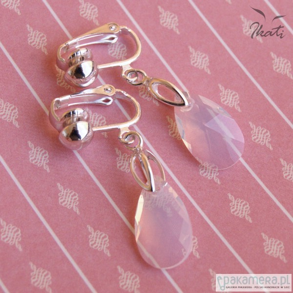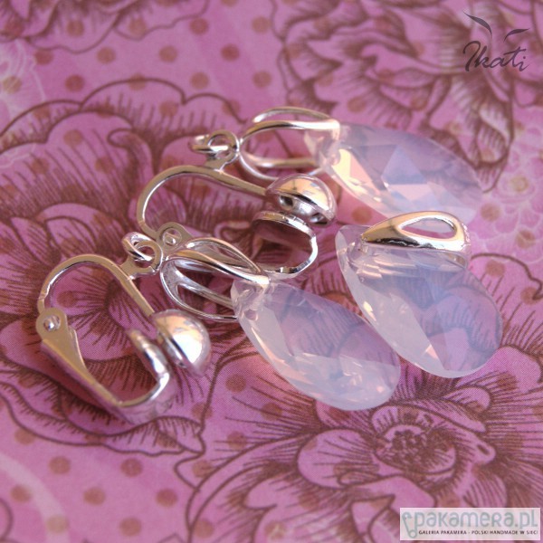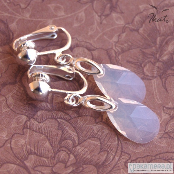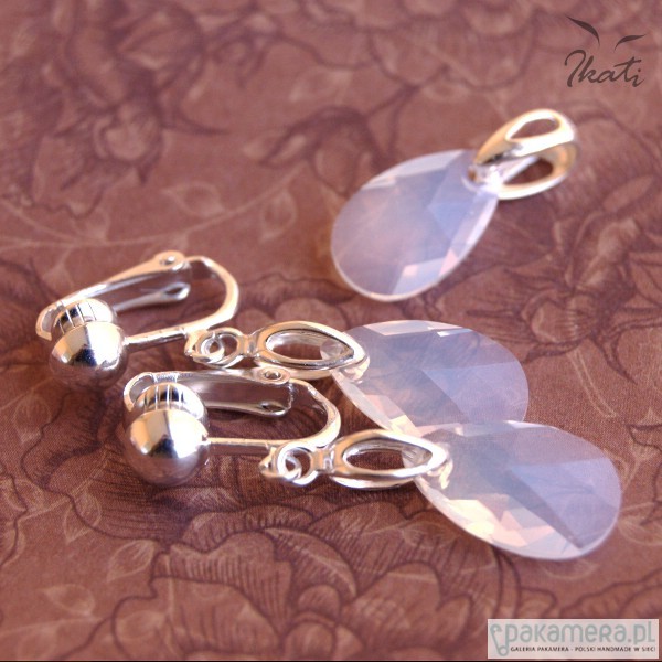 Przepiękny, niepowtarzalny komplet złożony z eleganckich klipsów oraz wisiora wykonanych z intensywnie połyskujących kryształów Swarovskiego w kształcie pękatych kropli (~1,6 cm) w kolorze Opal. Kryształy obłędnie połyskują, pięknie załamują światło. Zawieszone są na srebrnych krawatkach [925] i posrebrzanych klipsach. Będą przepięknym dodatkiem do sukni ślubnej. Całkowita długość klipsów: 3,7 cm.