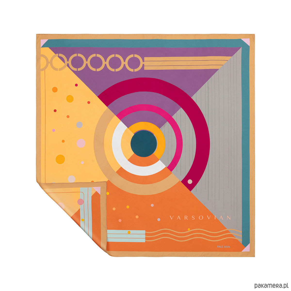 Trójkąty tworzą zrównoważony kwadrat, a jego stabilność ożywiają kolorowe półkoręgi, sprawiające wrażenie