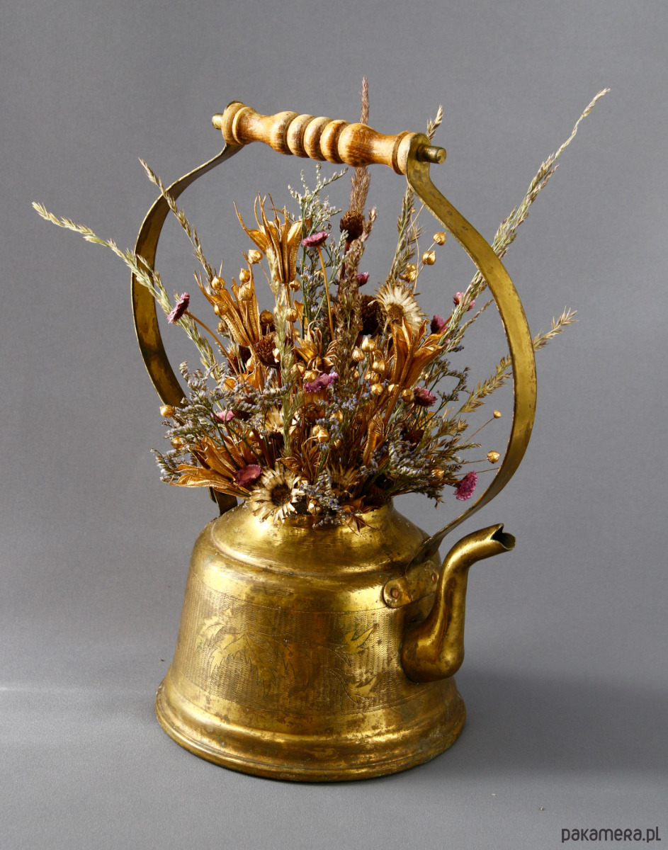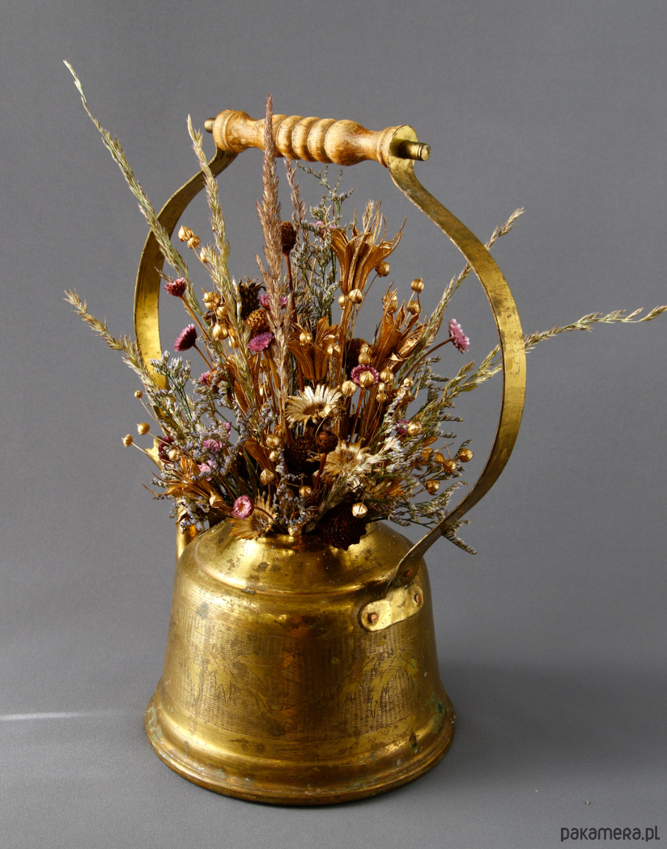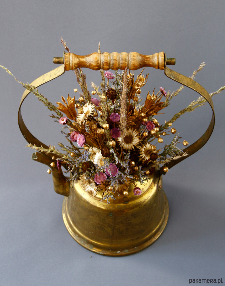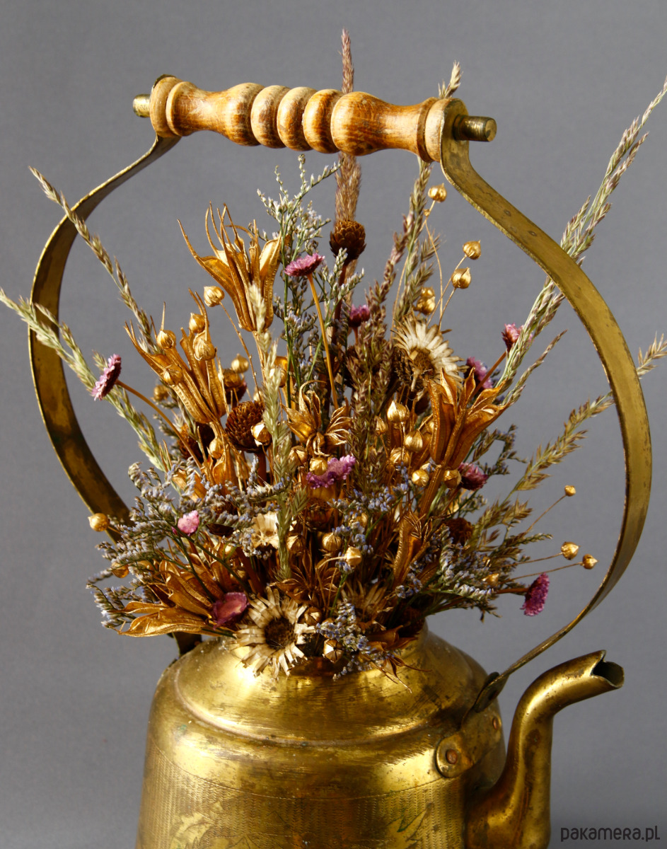 Unikatowa kompozycja kwiatowa ,,Zatrzymane w czasie" z naturalnych, barwionych kwiatów suszonych, osadzona w dekoracyjnym mosiężnym naturalnie spatynowanym imbryczku. Naczynie ma subtelnie orientalną formę. Piękny pałąk o wygiętej formie, wykończony drewnem, stanowi piękną efektowną ramę dla kwiatów. Kwiaty zostały starannie dobrane i ręcznie ułożone tak, by współgrać kolorem i formą naczynia. Całość utrzymana w ciepłych metalicznych tonach, przełamana fioletem kwiatów gliksji, który dodaje głębi kompozycji.