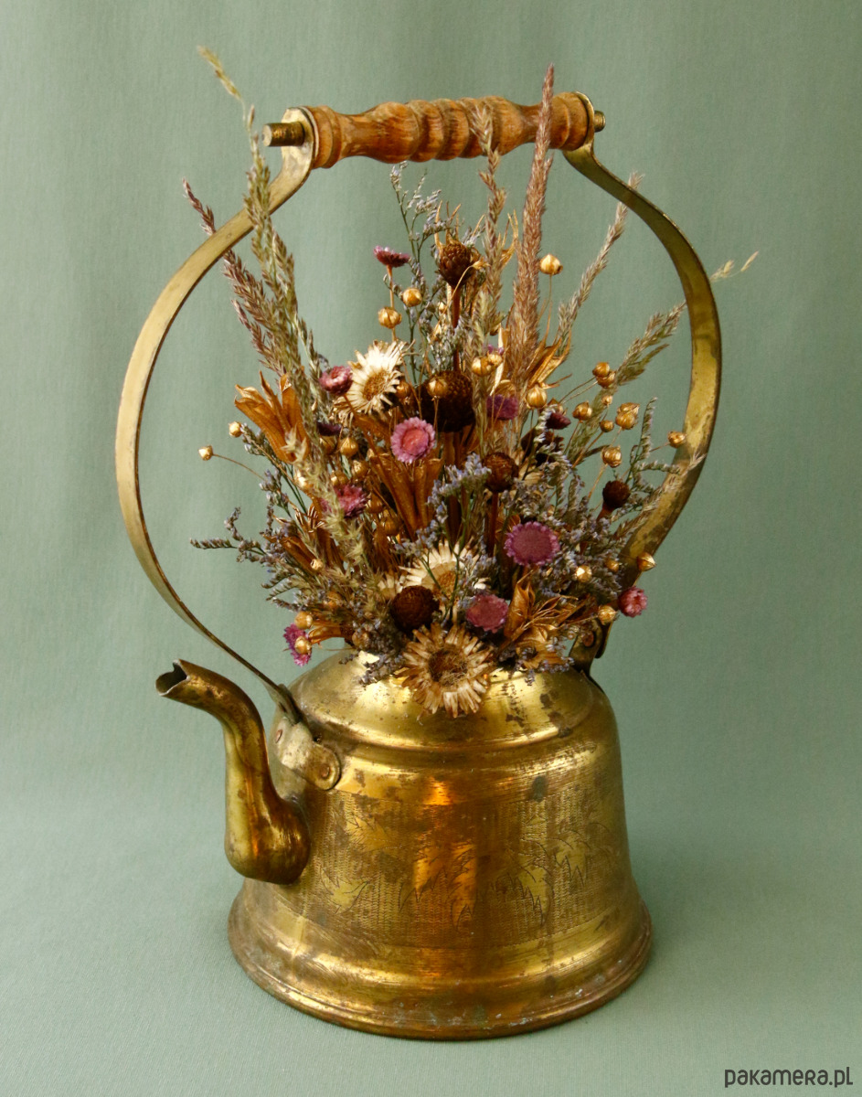Kompozycja ,,Zatrzymane w czasie" suszone kwiaty w starym mosiężnym imbryczku
