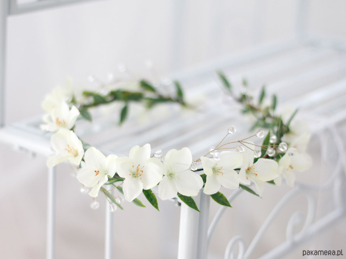 Romantyczny wianek na głowę, zdobiony kwiatami z tkaniny, syntetycznymi listkami i transparentnymi koralikami. Możliwość regulacji wielkości obwodu, dzięki koronkowej tasiemce z tyłu. Będzie pasował zarówno na głowę dziecka, jak i osoby dorosłej. Ozdoba będzie idealna na Pierwszą Komunię Świętą. Wianek wykonany ręcznie, z najwyższą starannością, w pracowni "Lola White" w Polsce.