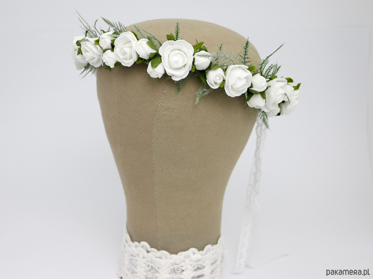 Romantyczny wianek na głowę, zdobiony jasnymi, foamiranowymi kwiatami i zielonymi listkami. Możliwość regulacji wielkości obwodu, dzięki koronkowej tasiemce z tyłu. Będzie pasował zarówno na głowę dziecka, jak i osoby dorosłej. Ozdoba będzie idealna na Pierwszą Komunię Świętą. Wianek wykonany ręcznie, z najwyższą starannością, w pracowni "Lola White" w Polsce.