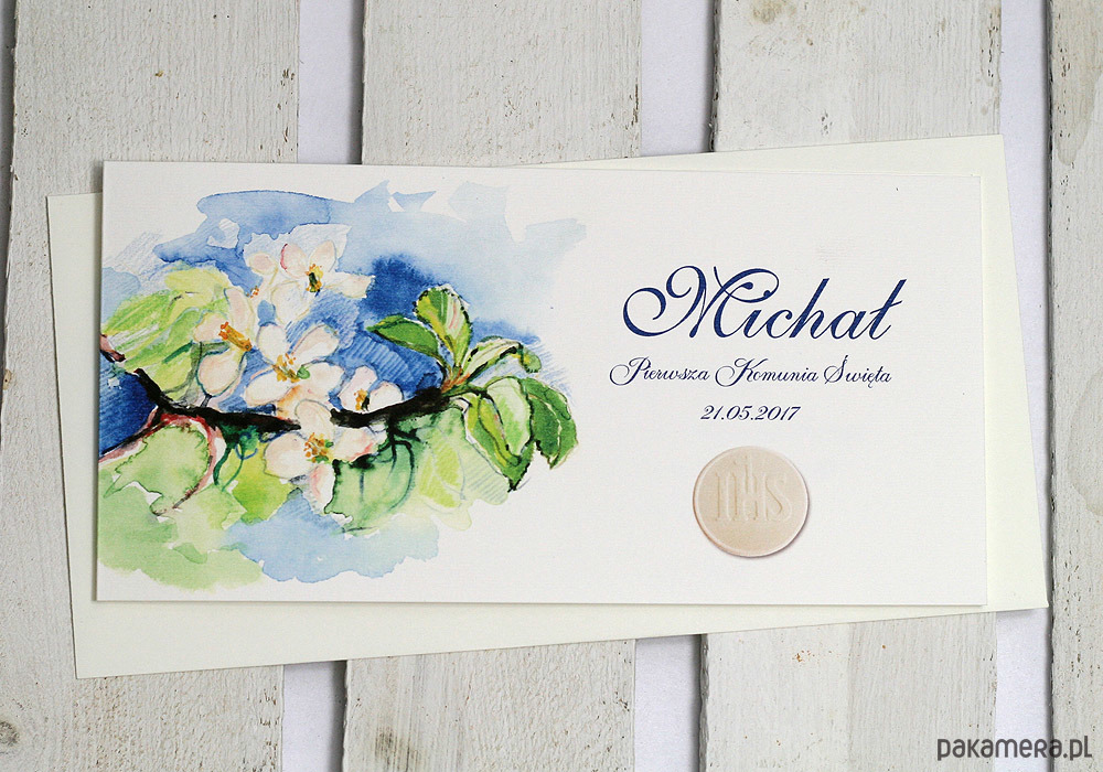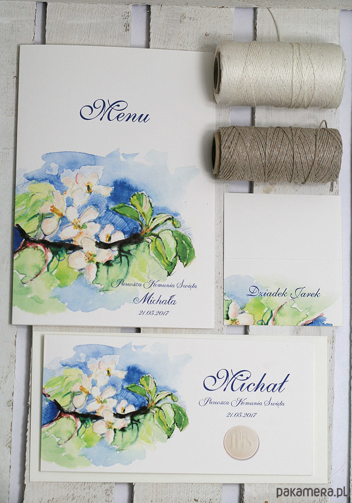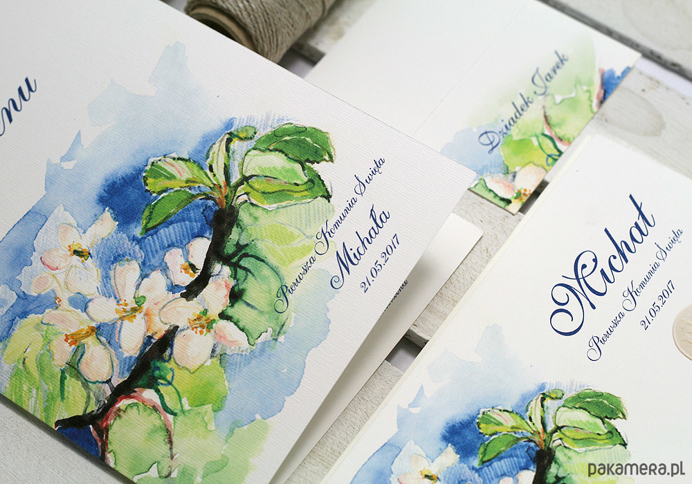 ZAPROSZENIA NA KOMUNIĘ - wzór JABŁOŃ - zaproszenie akwarelowe, drukowane, personalizowane.Do każdej kolekcji możliwość wykonania menu, winietek, podziękowań - napisz w wiadomości ilość sztuk oraz imię dziecka a my wystawimy dla Państwa zamówienie.