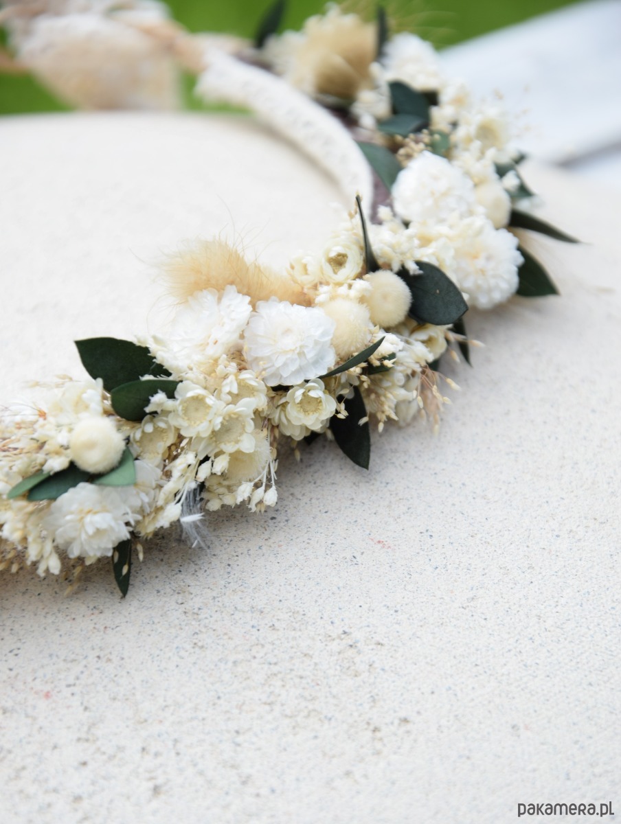 Delikatny, wianek na głowę z suszonych i stabilizowanych roślin to idealny dodatek do stylizacji Panny młodej,druhny lub małej dziewczynki na komunię.