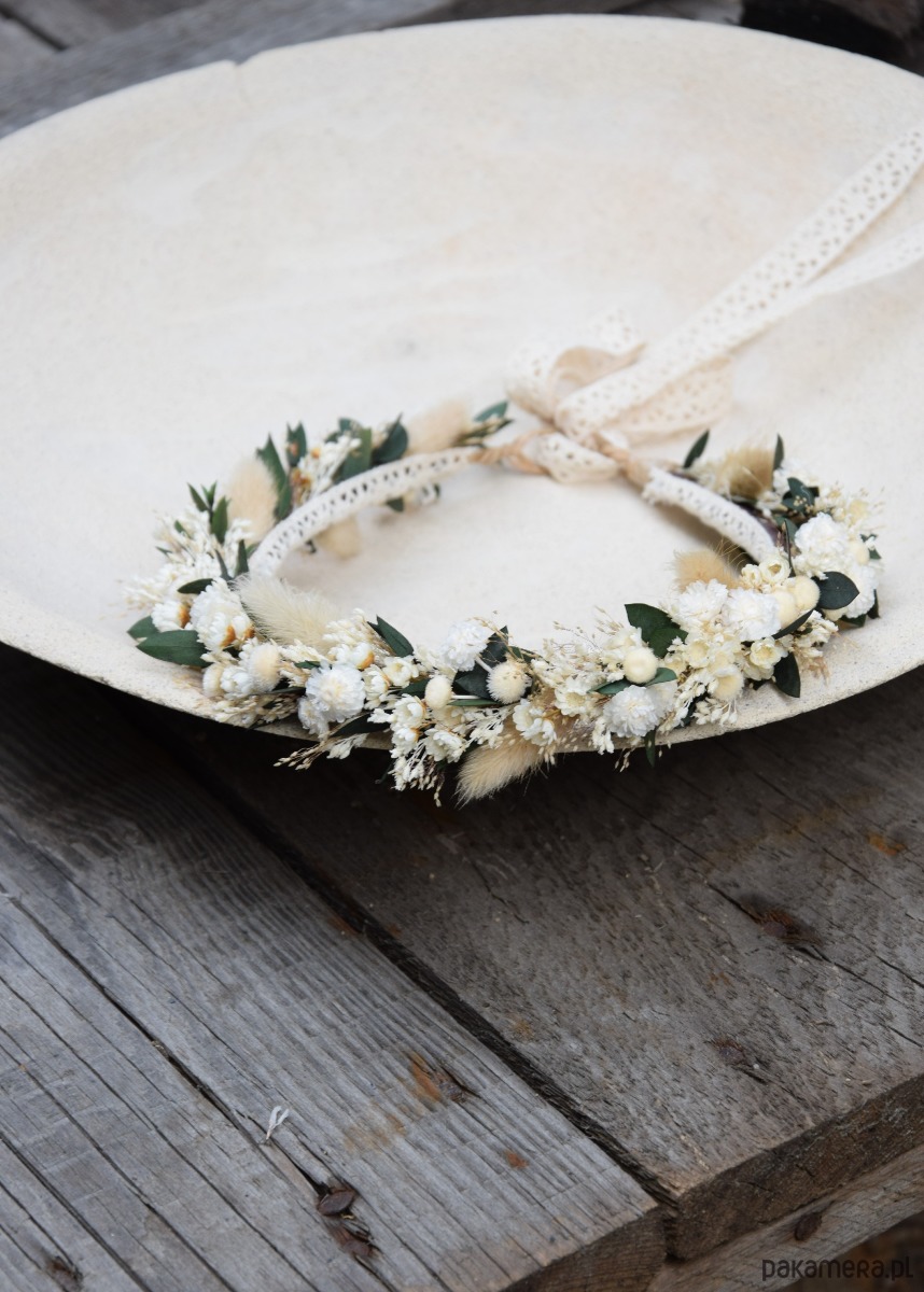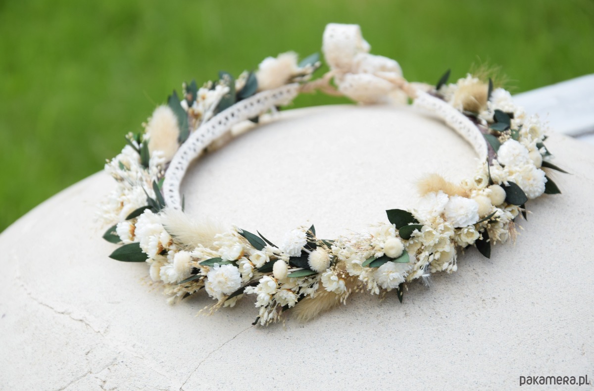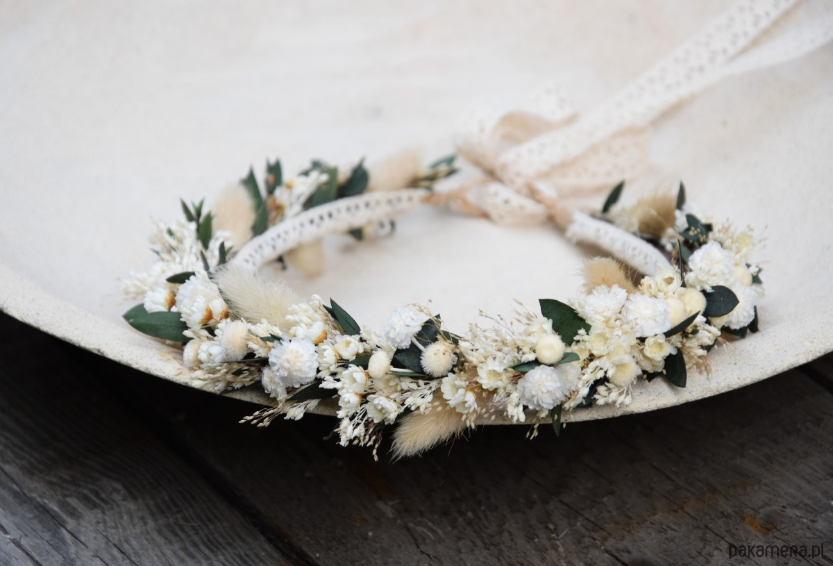 Delikatny, wianek na głowę z suszonych i stabilizowanych roślin to idealny dodatek do stylizacji Panny młodej,druhny lub małej dziewczynki na komunię.