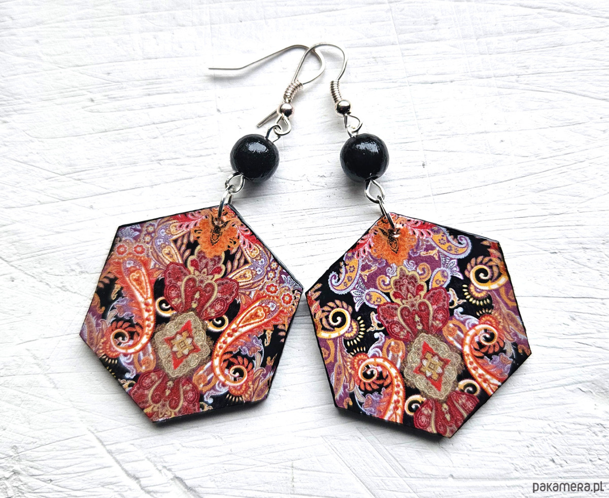 kolczyki drewniane, ozdobione metodą decoupage, dwustronne, starannie wykończone farbami akrylowymi i zabezpieczone wielokrotnie lakierem, koraliki drewniane, bigle posrebrzane, długość kolczyków bez bigli: 5 cm, szerokość: 3,2 cm, bardzo lekkie