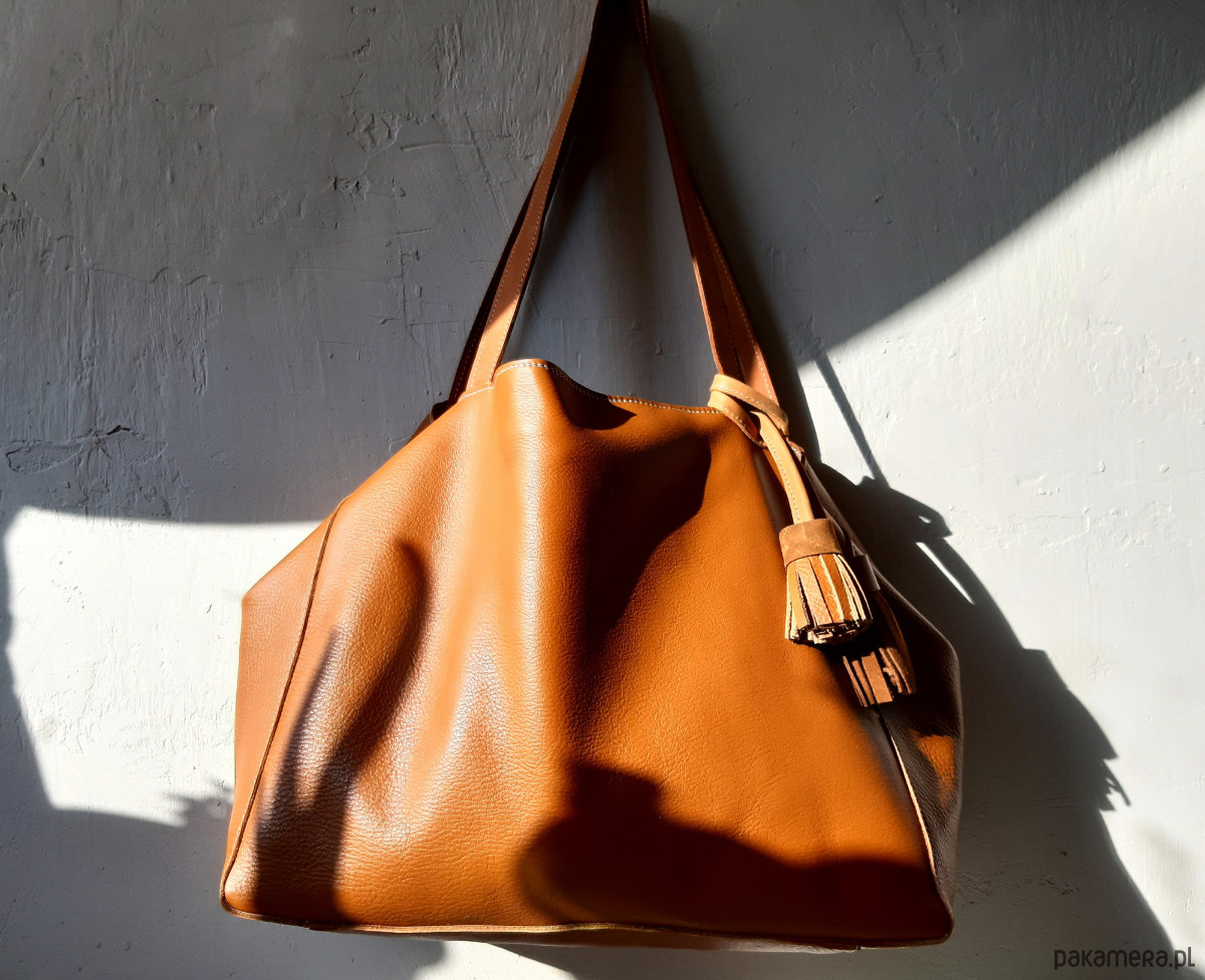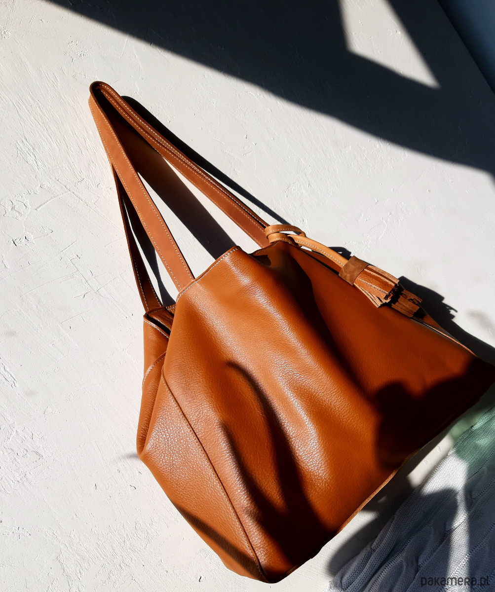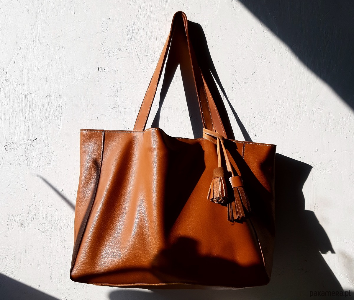 Przepiękna skórzana torba w kolorze koniakowym. To jest skóra naturalna, gładka miękka i mięsista.