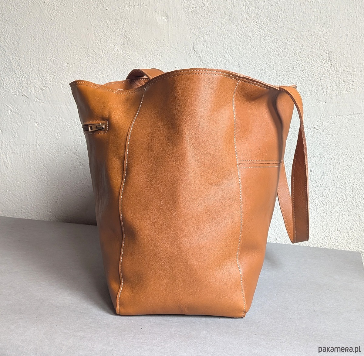 Torba z miękkiej skóry NATURALNEJ licowej, gładkiej, ładnie układa się podczas noszenia. Skóra grubsza, torba fajnie trzyma kształt. Skóra bardzo dobrej jakości.