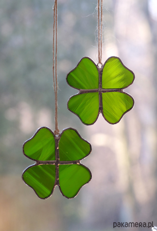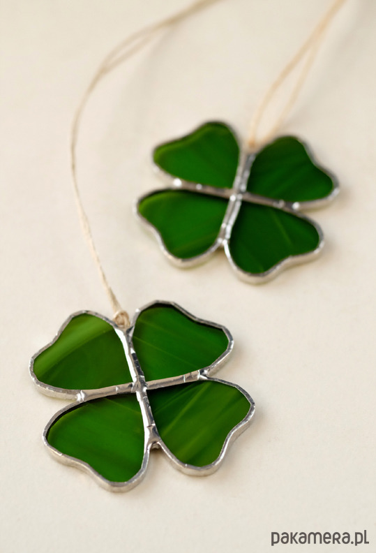 Koniczyna została wykonana z ręcznie wycinanego zielonego szkła witrażowego (niejednolitego zabarwionego), wykończona cyną. Koniczyna jest w całości ręcznie robiona z najwyższą starannością i dbałością o szczegóły.