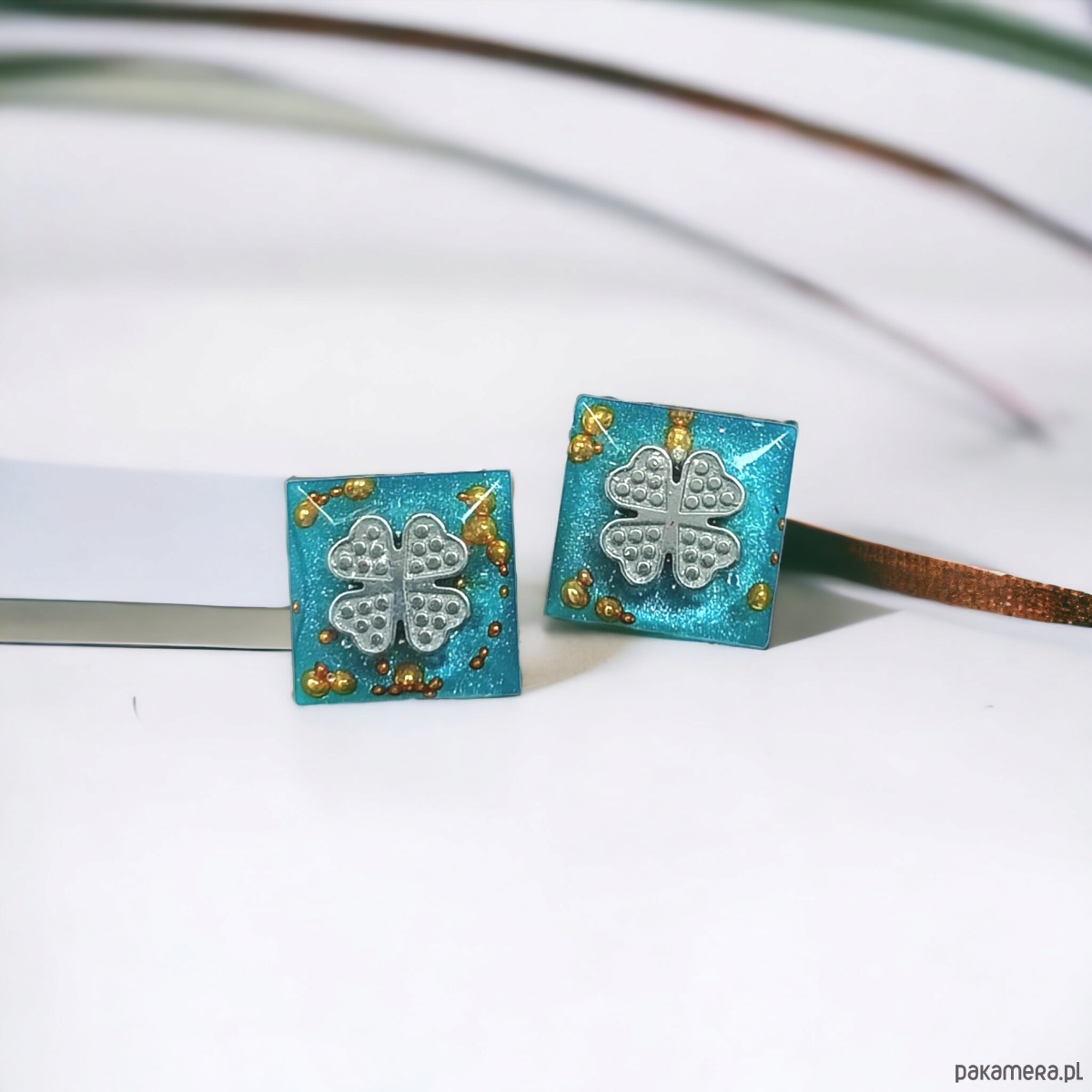 UNIKATOWE kolczyki z żywicy : z czterolistnymi koniczynkami na szczęście 🖤