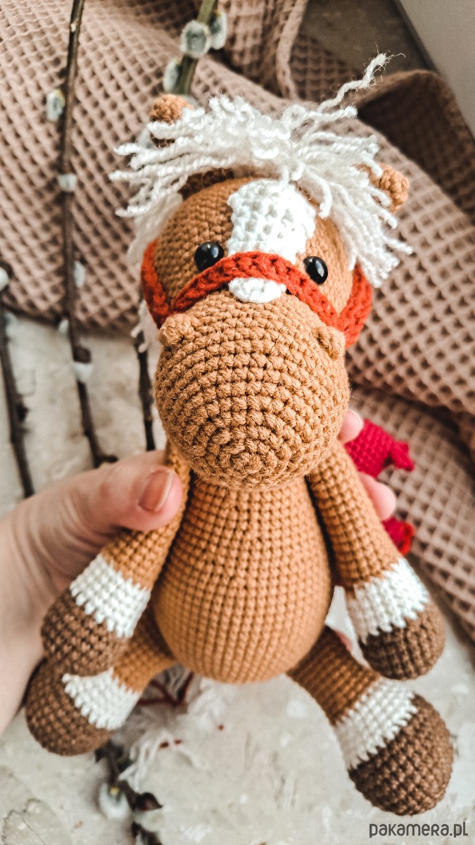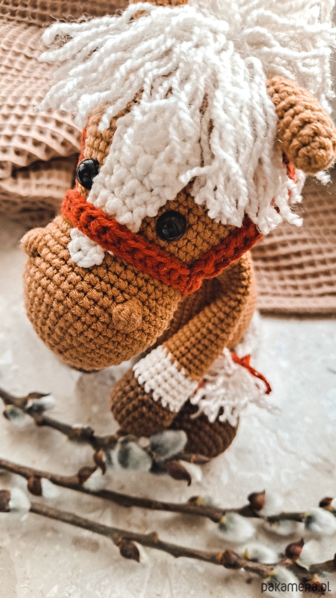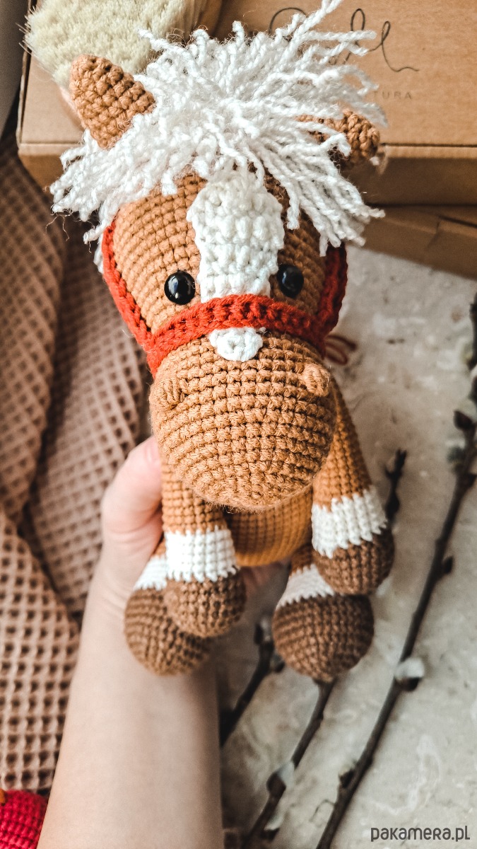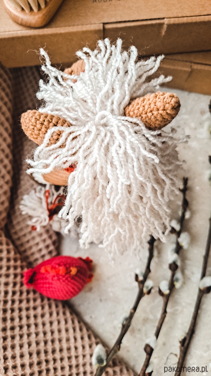 Maskotka wykonana z włóczki bawełnianej z domieszką akrylu.