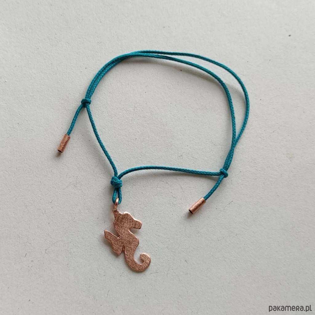 KONIK MORSKI bransoletka- zabawny dodatek. Ciekawy dodatek przykuwają uwagę i zaskakuje wzornictwem. Taka bransoletka sprawi, że każda stylizacja nabierze niepowtarzalnego, fantazyjnego charakteru. Bransoletka wykonana jest z: miedź , ozdobny sznurek. Srebro- zmatowione. Długość zawieszki 2 cm. Szeroko - 1 cm.
