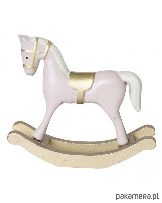 Konik na biegunach, wykonany z drewna. Zwierzęta mają siodła i uzdy. Figurka pięknie prezentuje się jako dekoracja świąteczna.