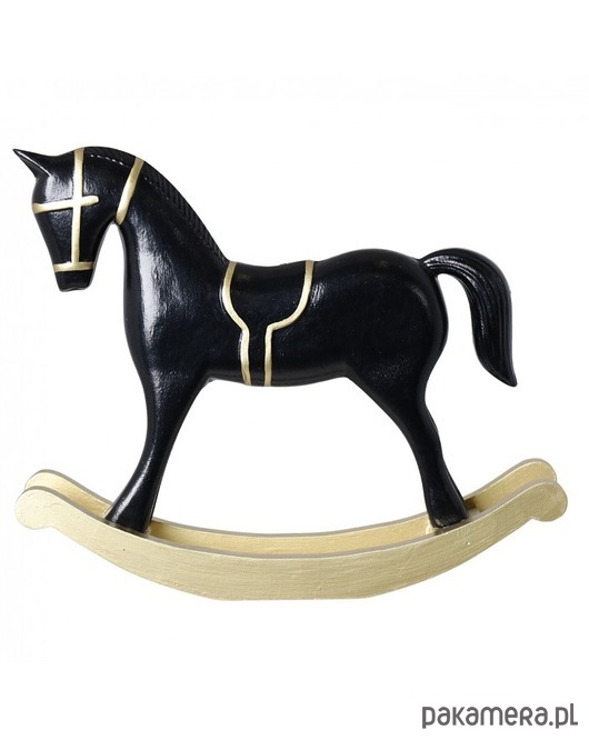 Konik na biegunach, wykonany z drewna. Zwierzęta mają siodła i uzdy. Figurka pięknie prezentuje się jako dekoracja świąteczna.