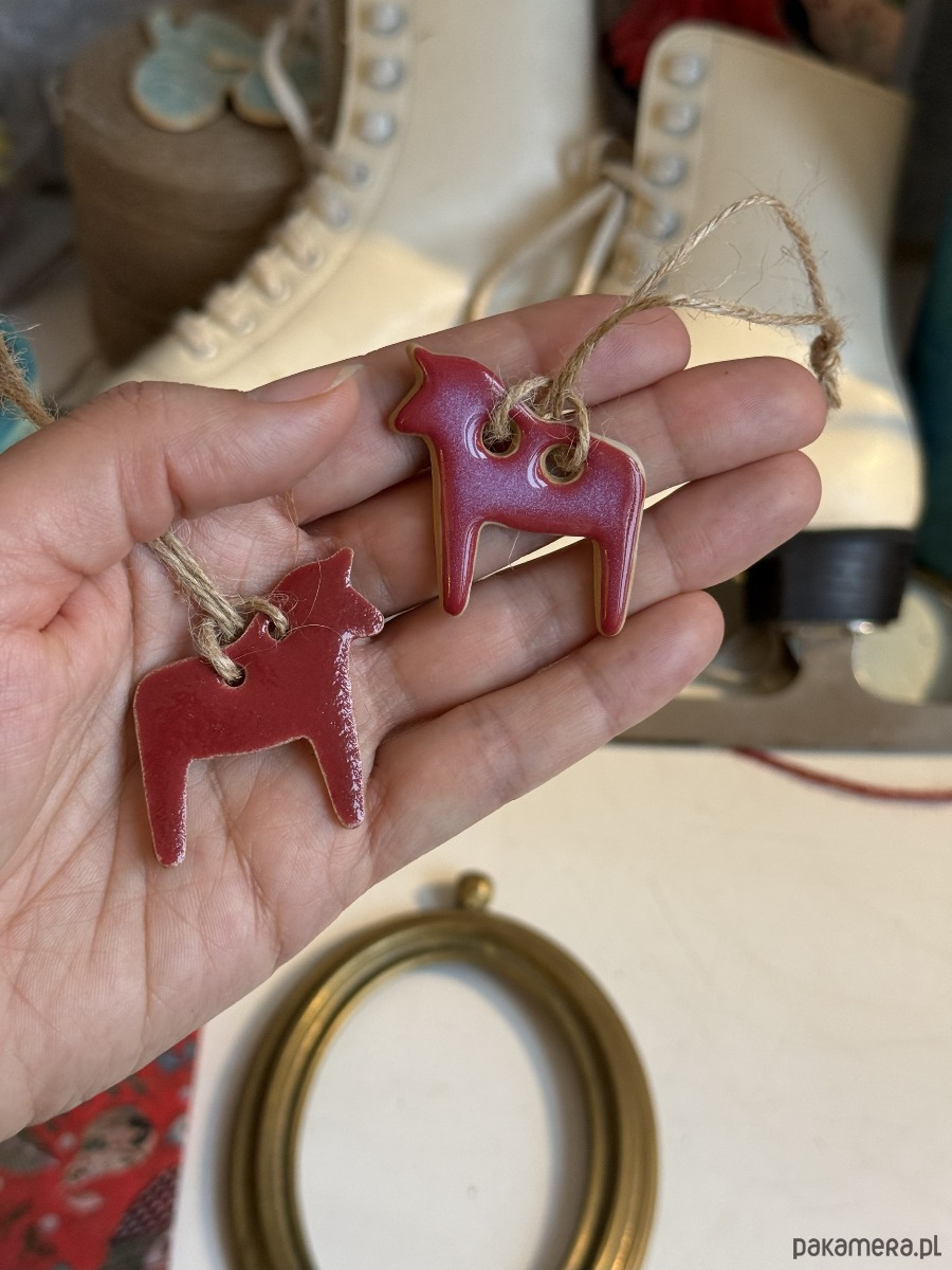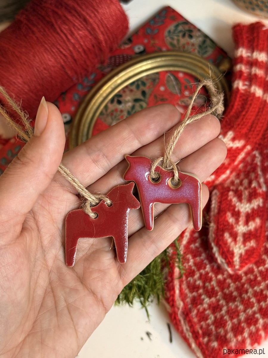 małe śliczne ceramiczne koniki zawieszki, zestaw 2 koników z czerwonymi szkliwami
