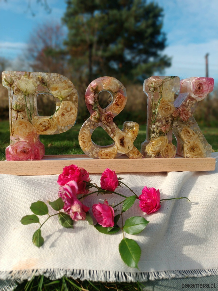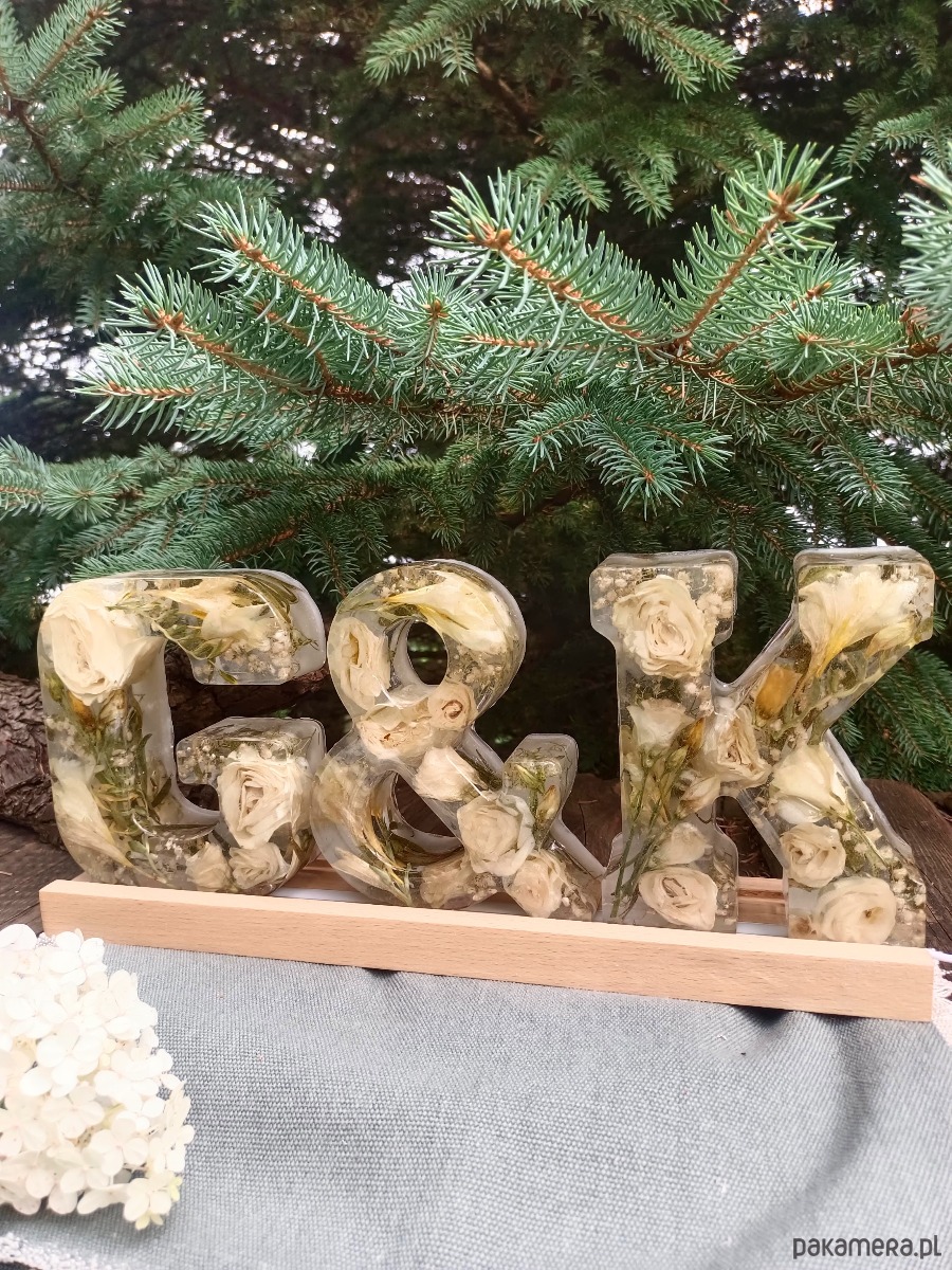 - Dekorację można zamówić również jako ozdobę w dowolnej kolorystyce z kwiatów pracowni. Większa ilość liter, imię, napis po wycenie indywidualnej.
