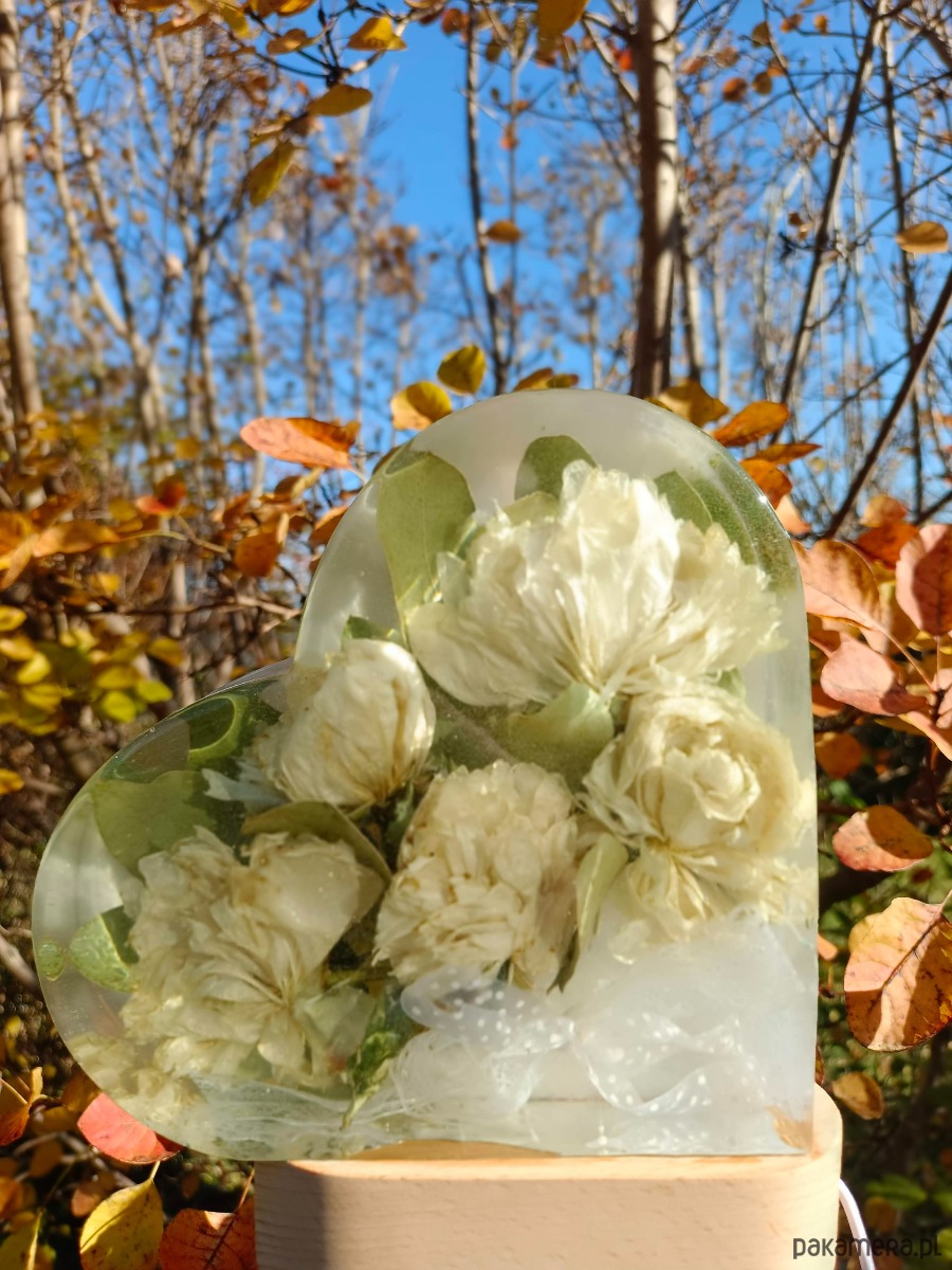 - Konserwacja bukietów w postaci pamiątek z autorskimi kompozycjami kwiatowymi utrwalonymi w żywicy.