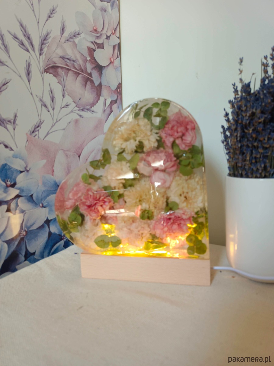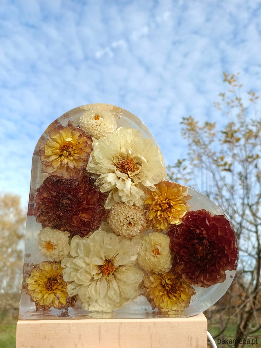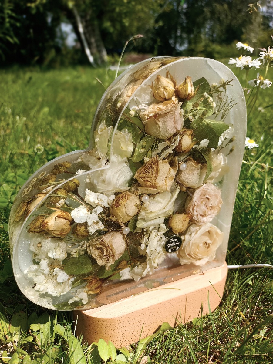 - Lampka w kształcie serca - wykonywana w głębokiej formie z kwiatów przestrzennych i drobnych. Serce na drewnianej podstawie z podświetleniem LED, zasilane kablem usb.