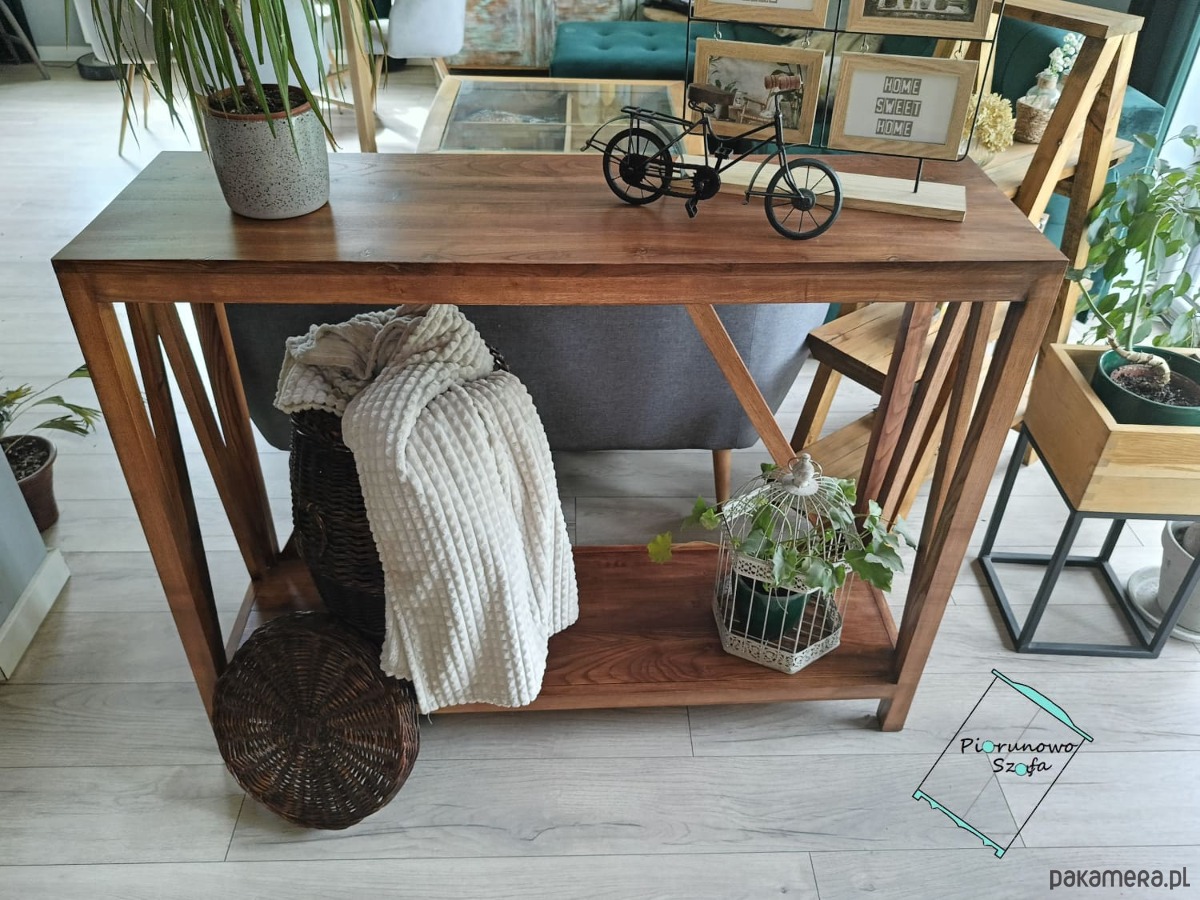 Stylowa i uniwersalna konsola drewniana, która doda wnętrzu charakteru i jednocześnie zapewni praktyczne miejsce do przechowywania. Idealna do salonu, przedpokoju, gabinetu czy sypialni, wyróżnia się minimalistycznym designem i naturalnym pięknem drewna.