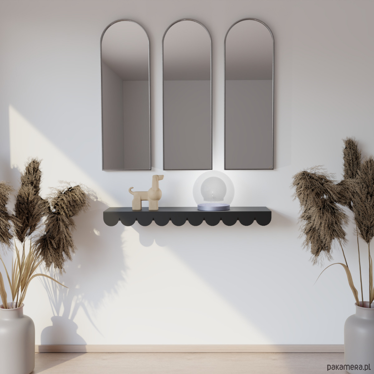 Falista przednia ścianka dodaje lekkości i przyciąga wzrok, a smukła forma nie przytłacza wnętrza. Blat oferuje praktyczną przestrzeń na książki, dekoracje lub lampkę, a stalowa konstrukcja malowana proszkowo zapewnia trwałość i łatwe czyszczenie. Konsola Onda sprawdzi się w nowoczesnych i eklektycznych wnętrzach, wprowadzając harmonię i subtelną elegancję. Standardowo dostępna w czerni i bieli, możliwe są również indywidualne zamówienia kolorystyczne i wymiarowe.