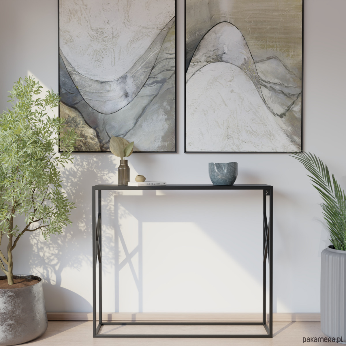 Minimalistyczny, geometryczny design nadaje wnętrzu elegancji i harmonii, a blat zapewnia przestrzeń na dekoracje, lampę czy drobiazgi. Lekka forma sprawia, że mebel pasuje także do mniejszych pomieszczeń, wprowadzając nowoczesny akcent. Solidna stalowa rama gwarantuje trwałość i odporność, a minimalistyczny styl pozwala łatwo dopasować konsolę do różnych aranżacji. Recta dostępna jest w klasycznej czerni i bieli, z możliwością wykonania w innym rozmiarze lub kolorze.