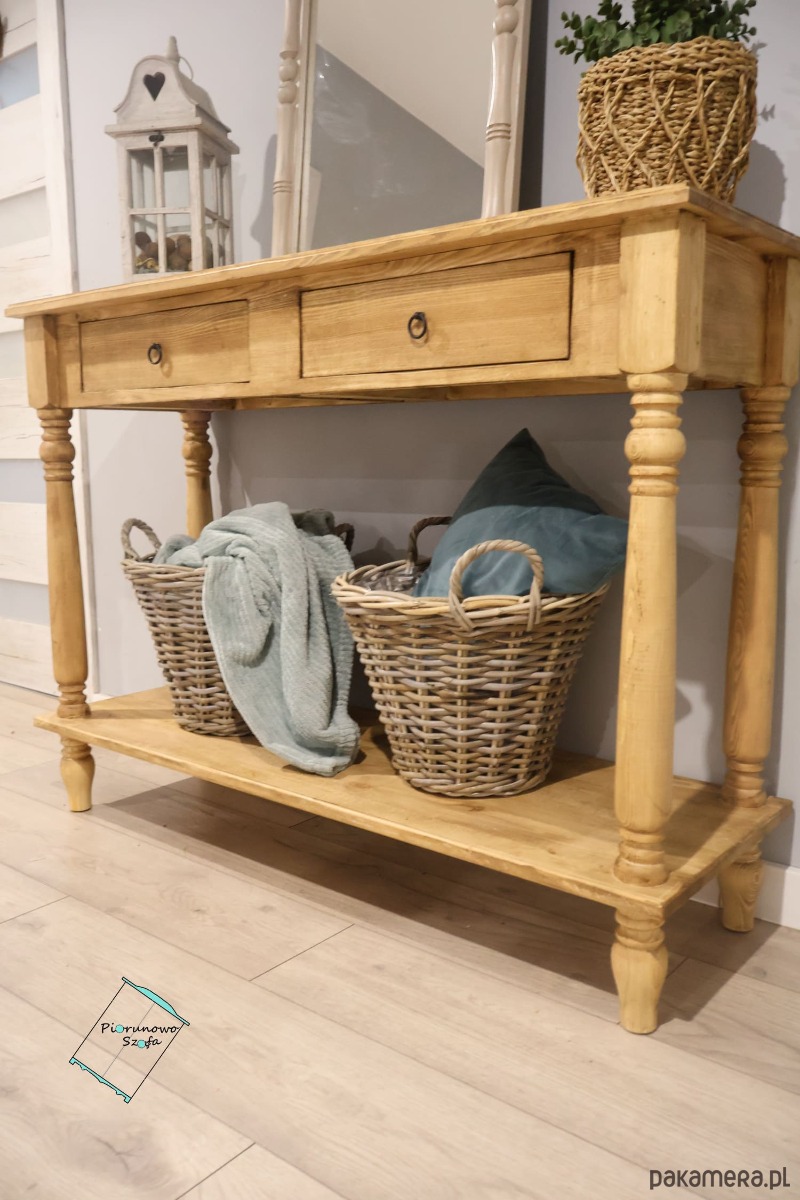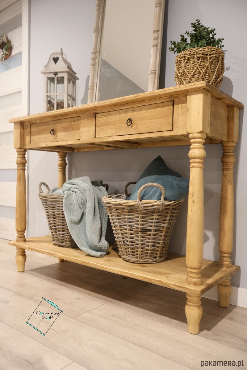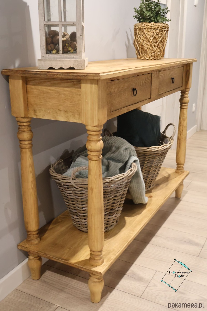 Konsola rustykalna, Vintage z litego drewna, toczone nog