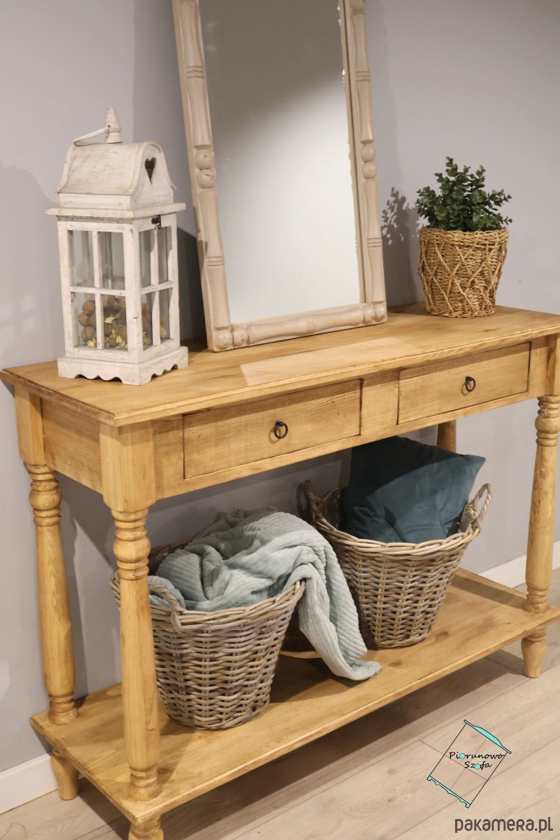 Dodatki: Kompozycja na zdjęciu – lustro w drewnianej ramie, latarnia w stylu vintage oraz wiklinowe kosze – pokazuje, jak pięknie konsola wkomponuje się w przestrzeń z dodatkami o naturalnym charakterze.